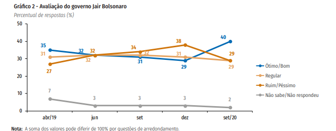 O índice daqueles que confiam cresceu de 41%, em dezembro de 2019, para 46%, em setembro de 2020. O percentual é inferior ao apurado no início do governo, em abril de 2019: 51%. Os que não confiam são 46% e 3% não sabem ou não responderam.