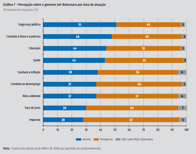 Já a aprovação e desaprovação da área de combate ao desemprego cai da terceira para a sétima posição no ranking, com oscilação para pior, de 41% para 37%.