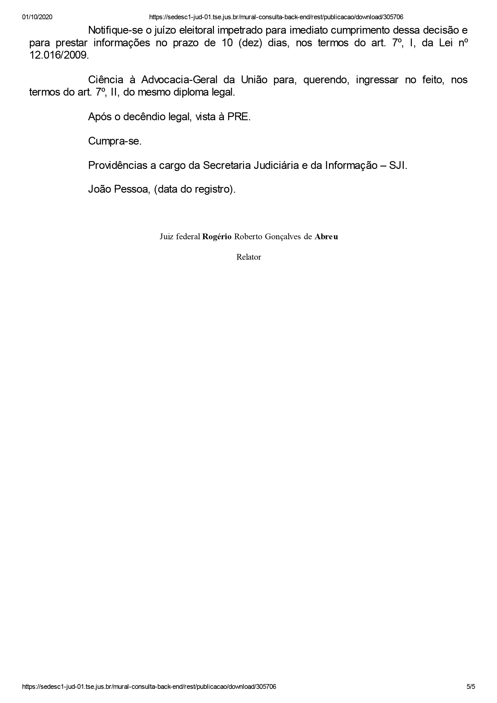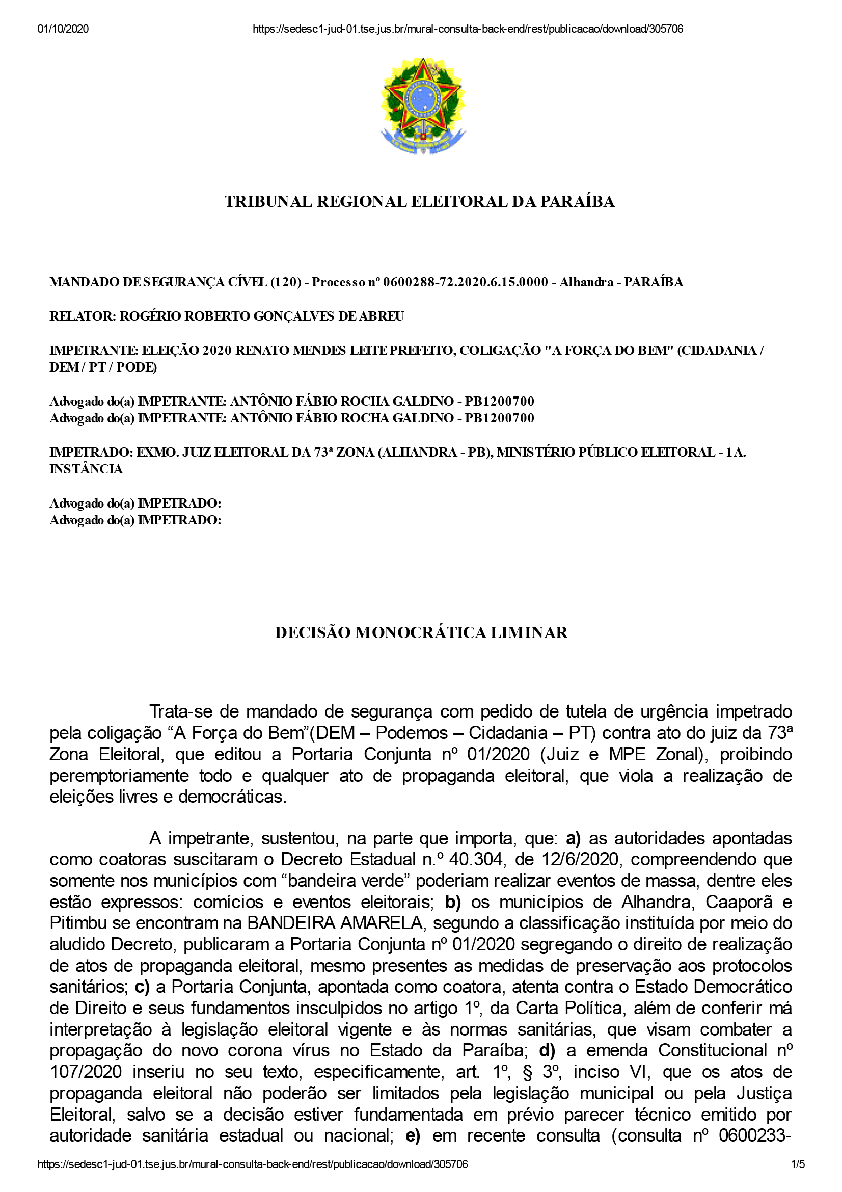 O juiz federal Rogério Roberto Gonçalves de Abreu deferiu mandado de segurança permitindo a realização de eventos de campanha política municípios na 73ª Zona Eleitoral (Alhandra, Caaporã e Pitimbu). A decisão derruba a portaria que havia sido emitida pelo juiz e promotor da zona proibindo eventos que resultassem em aglomeração, pelo fato de as cidades estarem classificadas na bandeira amarela.