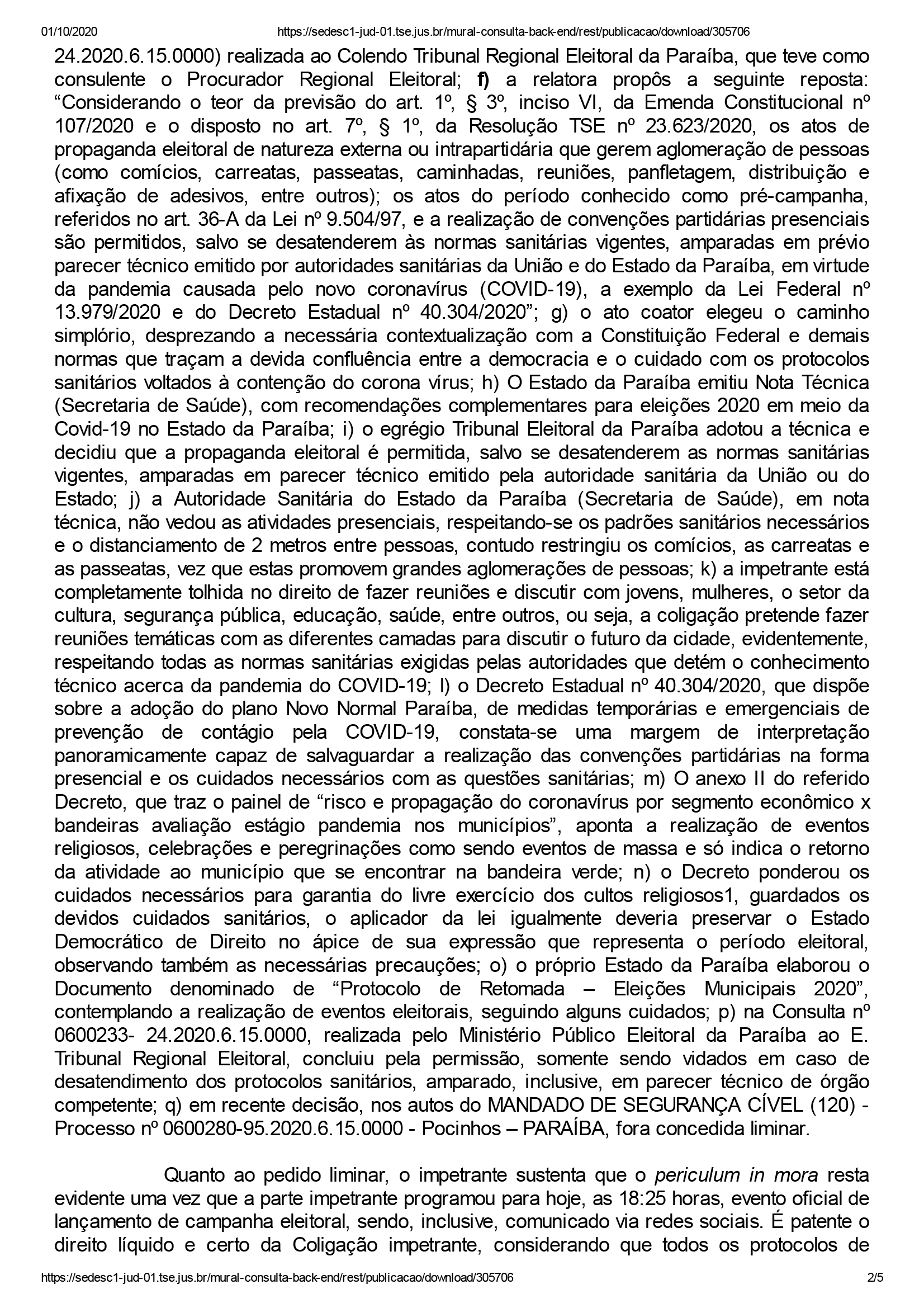 A decisão, a qual o ClickPB teve acesso, baseia-se principalmente na Emenda Constitucional n. 107/2020, que dispõe que “os atos de propaganda eleitoral não poderão ser limitados pela legislação municipal ou pela Justiça Eleitoral, salvo se a decisão estiver fundamentada em prévio parecer técnico emitido por autoridade sanitária estadual ou nacional”. O relator apontou que a bandeira amarela limita a mobilidade da população, mas não a proíbe.