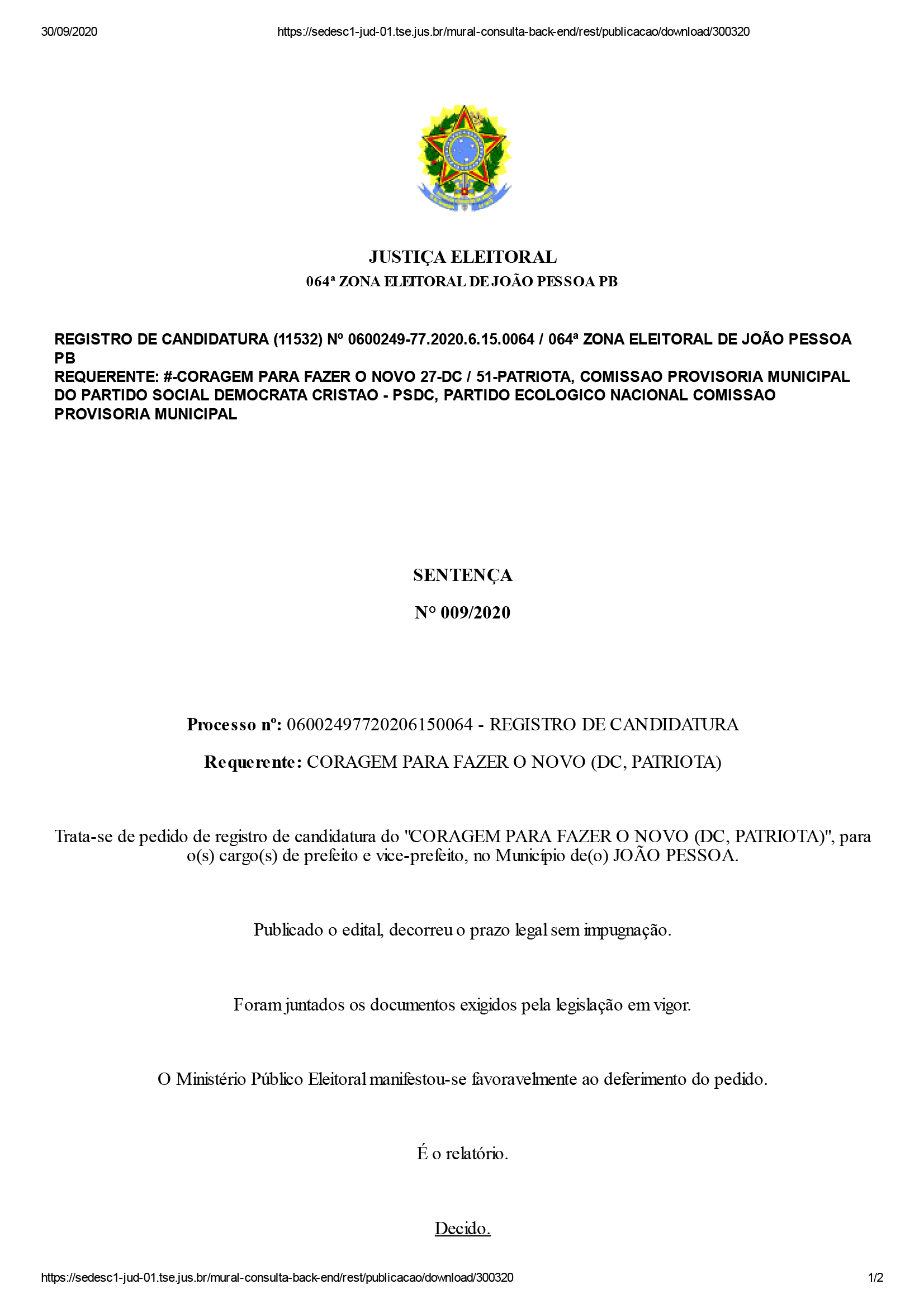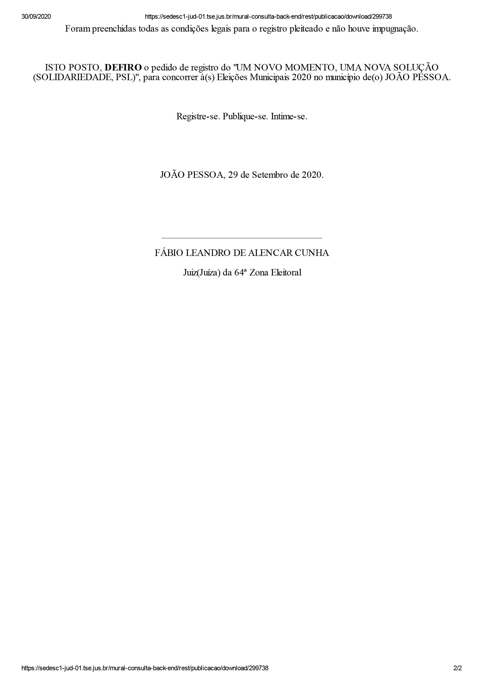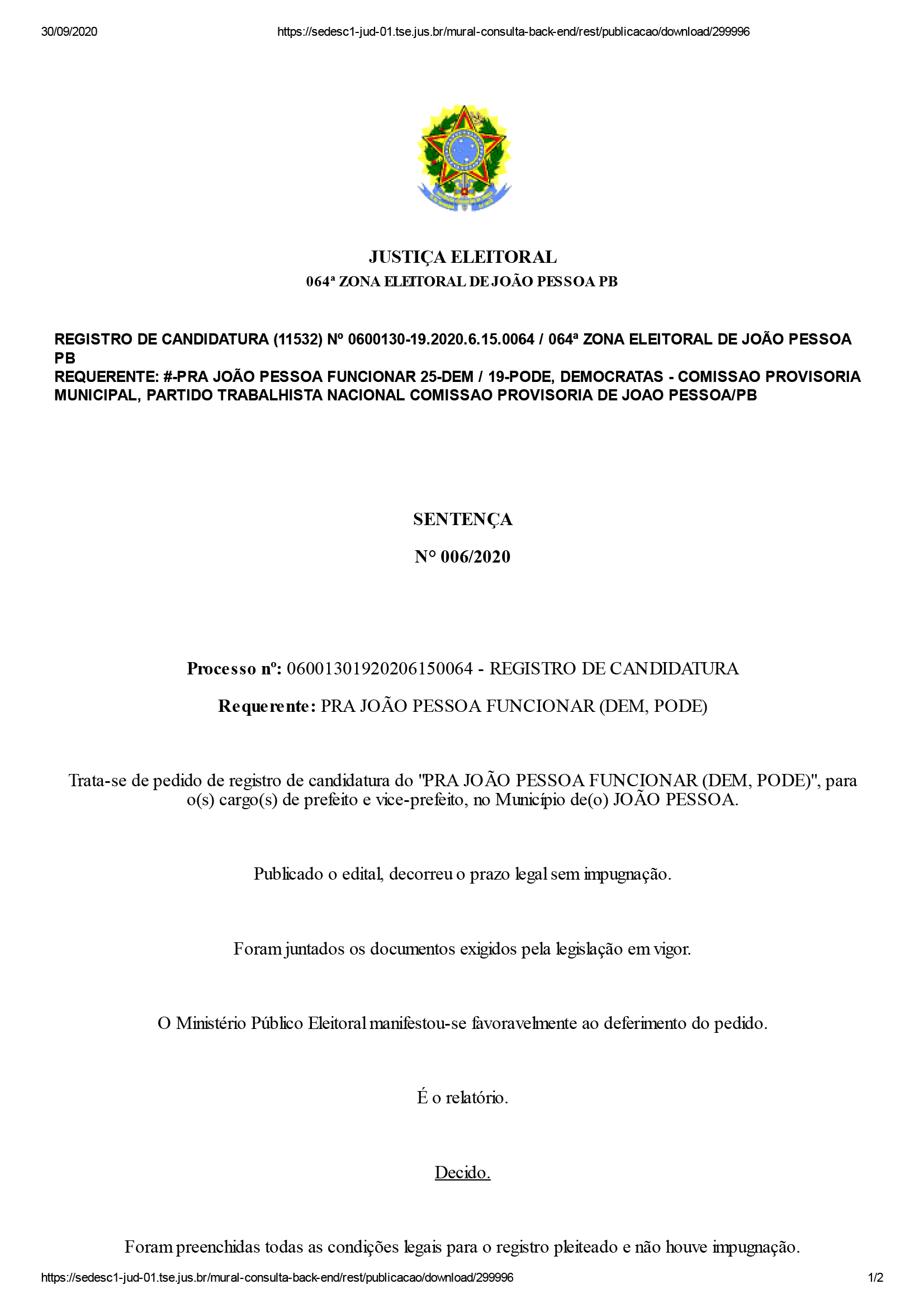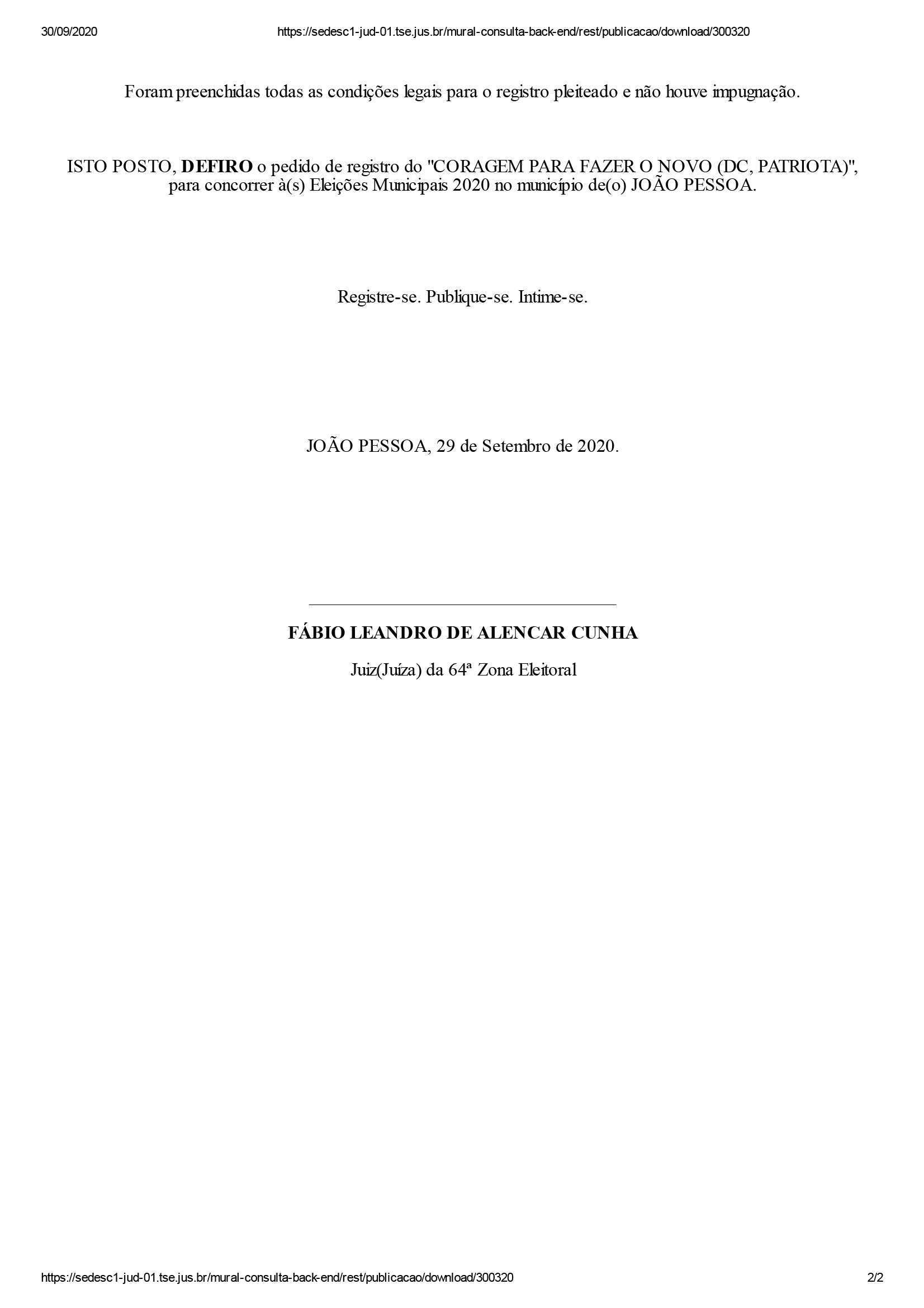 Segundo o juiz, não houve pedidos de impugnação contra essas candidaturas. “Foram preenchidas todas as condições legais para o registro pleiteado e não houve impugnação. ISTO POSTO, DEFIRO o pedido de registro”, disse o juiz em cada um dos documentos que contém a sentença de deferimento.
