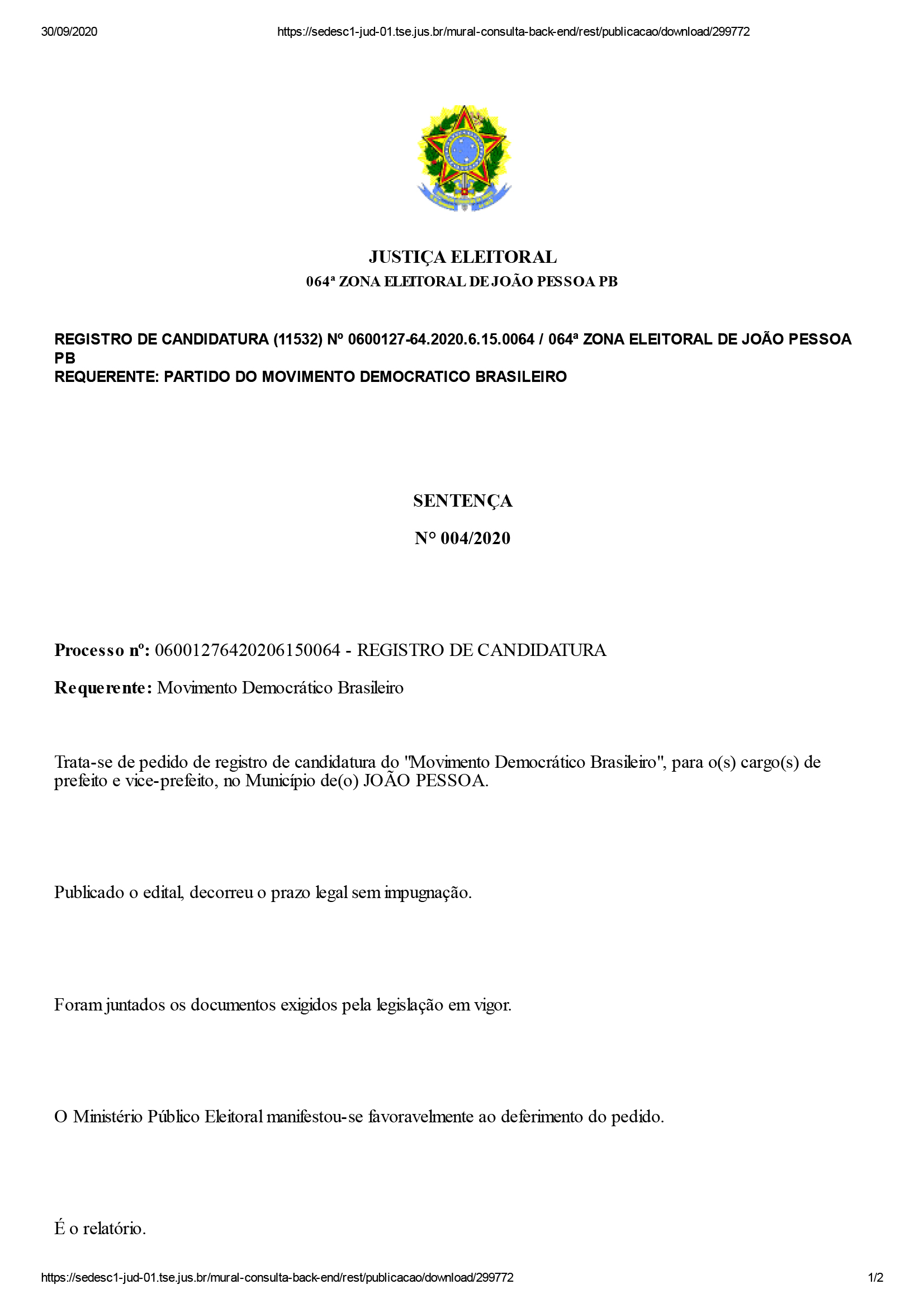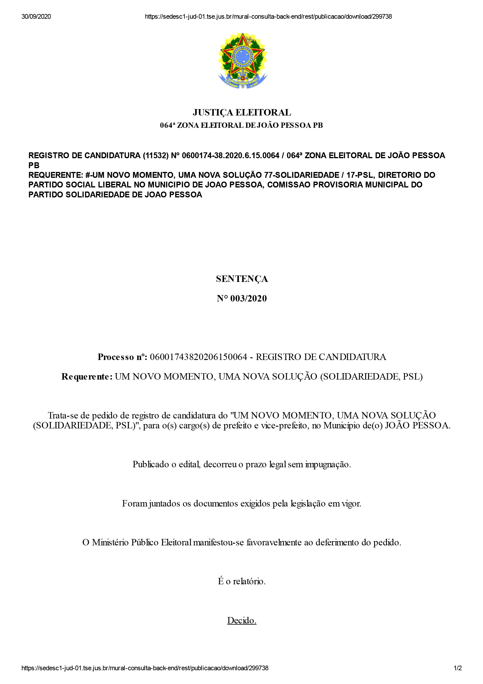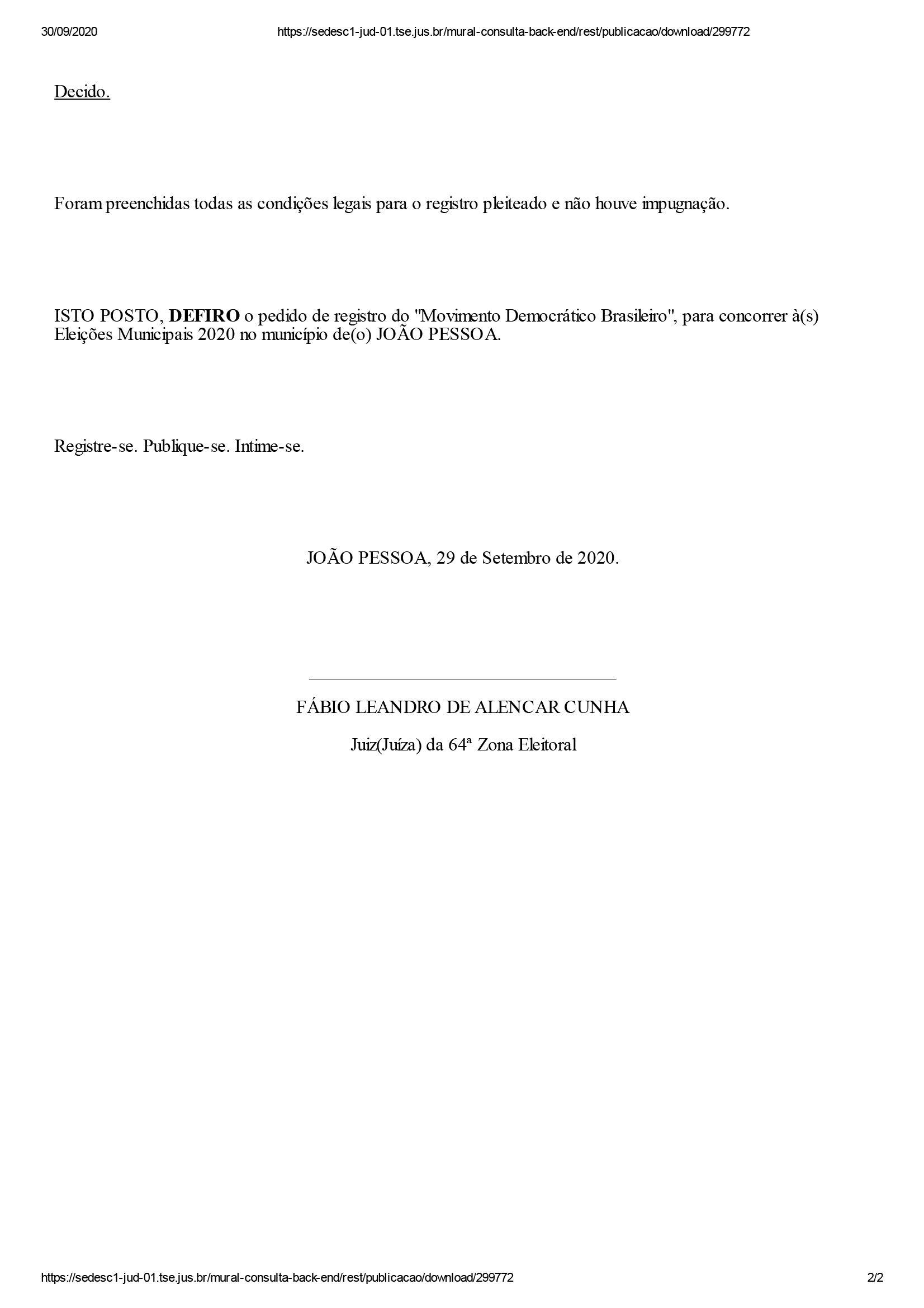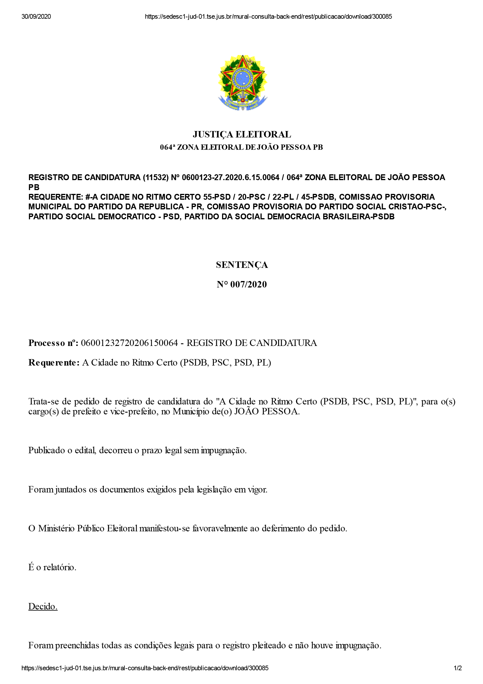 Segundo o juiz, não houve pedidos de impugnação contra essas candidaturas. “Foram preenchidas todas as condições legais para o registro pleiteado e não houve impugnação. ISTO POSTO, DEFIRO o pedido de registro”, disse o juiz em cada um dos documentos que contém a sentença de deferimento.