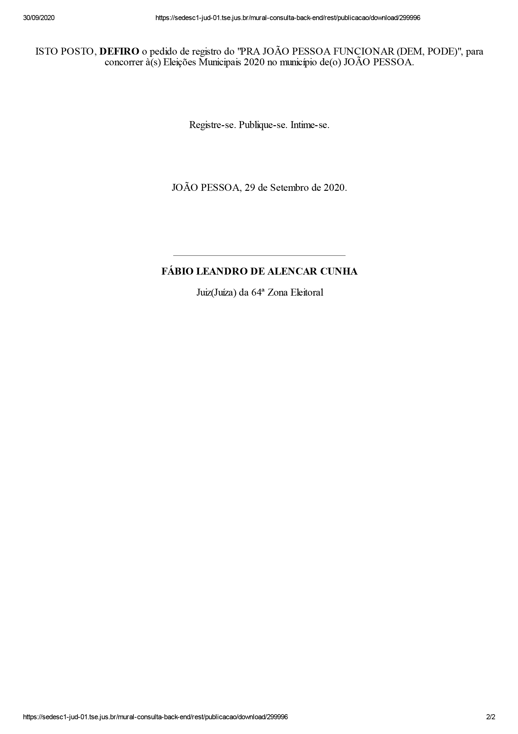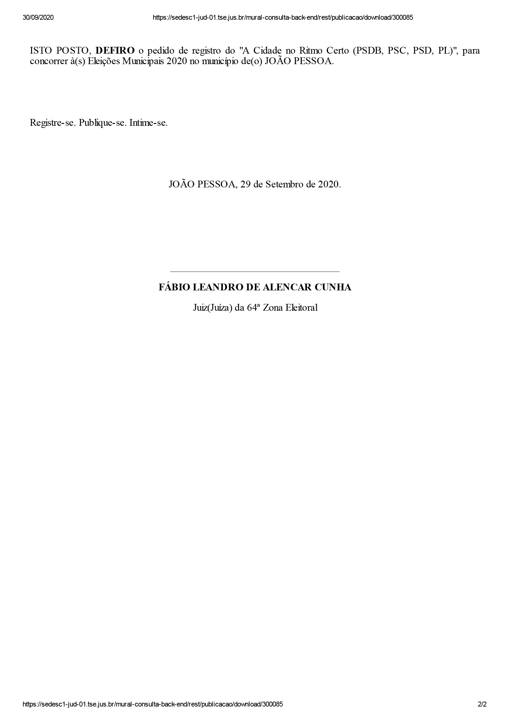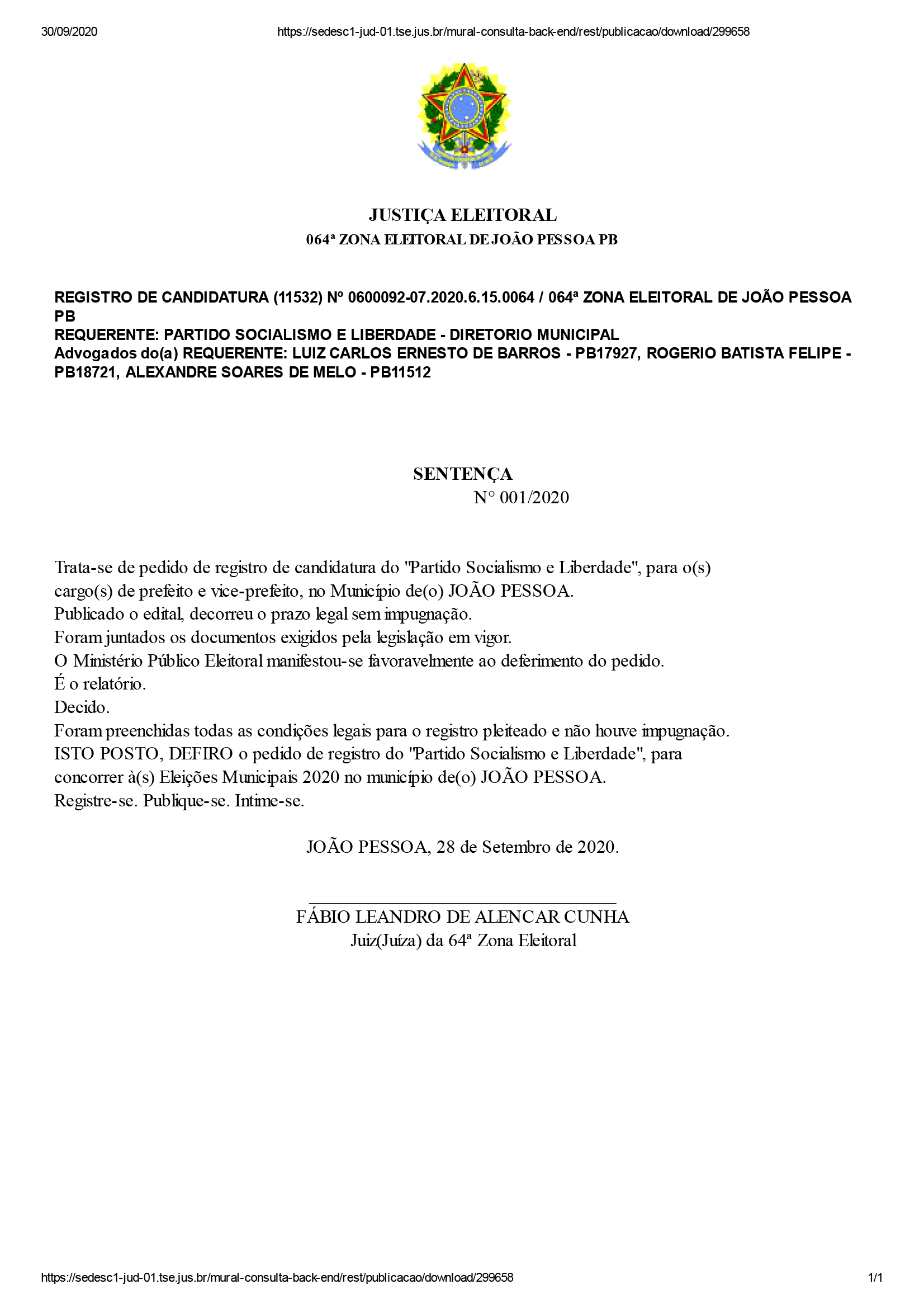 O juíz Fábio Leandro de Alencar Cunha, da 64ª Zona Eleitoral, deferiu os pedidos de seis coligações para registro de candidaturas a prefeito e vice-prefeito de João Pessoa. MDB, DEM, PSOL, Solidariedade, PSDB e Patriota tiveram registros deferidos, de acordo com informações obtidas pelo ClickPB.
