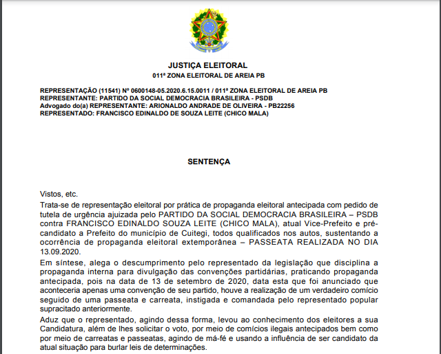 A Justiça da 11ª Zona Eleitoral, com sede da cidade de Areia, condenou Francisco Edinaldo de Souza Leite (Chico Mala), candidato a prefeito de Cuitegi, ao pagamento de multa de R$ 5.000,00 (cinco mil reais) por realização de propaganda eleitoral antecipada durante a convenção do Cidadania, realizada no dia 13 de setembro deste ano.