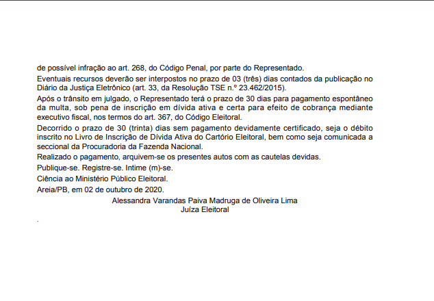 O pagamento da multa, conforme a decisão judicial, deverá ser quitado num período de 30 dias após o julgamento da ação, deferido em 02 de outubro, caso contrário o débito será inscrito no Livro de Inscrição da Dívida Ativa do Cartório Eleitoral, bem como seja comunicada a seccional da Procuradoria da Fazenda Nacional.