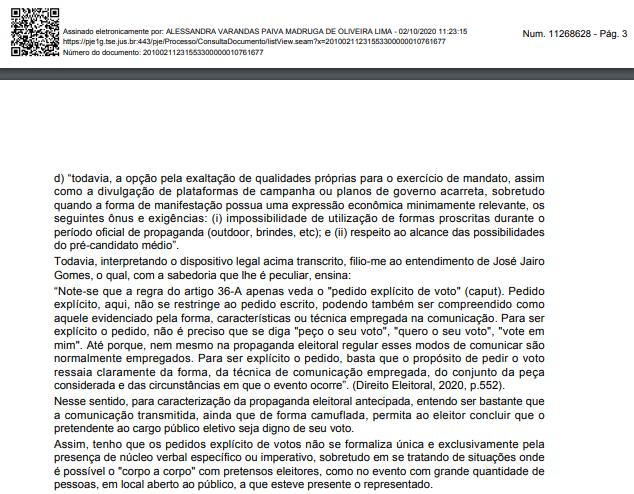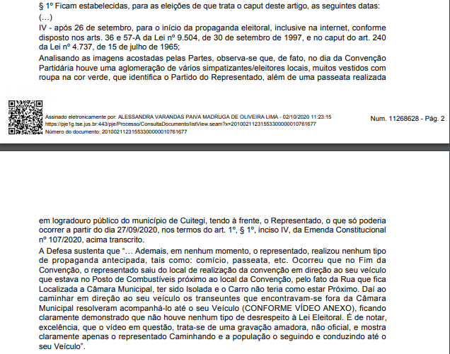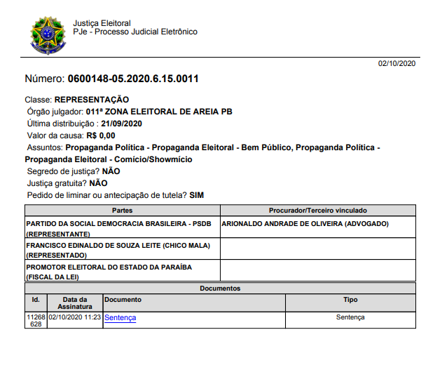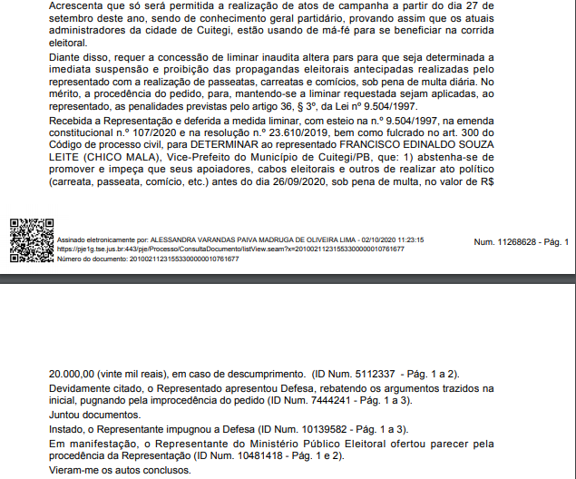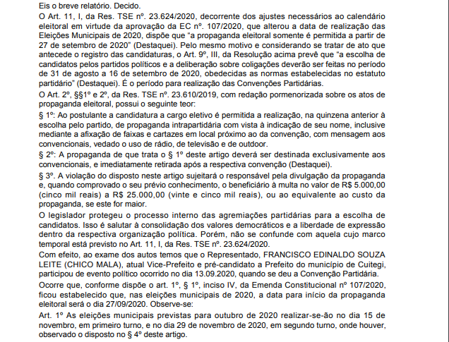 Nas alegações finais, a juíza escreve: “Em razão de todo o exposto, ratifico a liminar e, no mérito, JULGO PROCEDENTE O PEDIDO, na forma do art. 487, I, do Código de Processo Civil, para reconhecer a ocorrência de propaganda eleitoral antecipada e, com isso, com fulcro no art. 36, § 3º, da Lei n. 9.504/97 c/c o art. 2º, §§ 1º e 2º, da Res. TSE nº. 23.610/2019, condenar FRANCISCO EDINALDO SOUZA LEITE (CHICO MALA) ao pagamento de multa no valor de R$ 5.000,00 (cinco mil reais), pelo que resolvo o processo com resolução de mérito.”