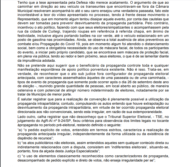 Conforme decisão da juíza Alessandra Varandas Paiva Madruga de Oliveira Lima, titular da 11ª Zona Eleitoral, o ato público em que participou o candidato do Cidadania após a convenção ficou caracterizado como propaganda eleitoral antecipada, inclusive com a participação de eleitores de seu grupo político, conforme provas apresentadas pelos advogados do PSDB.