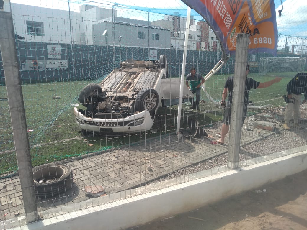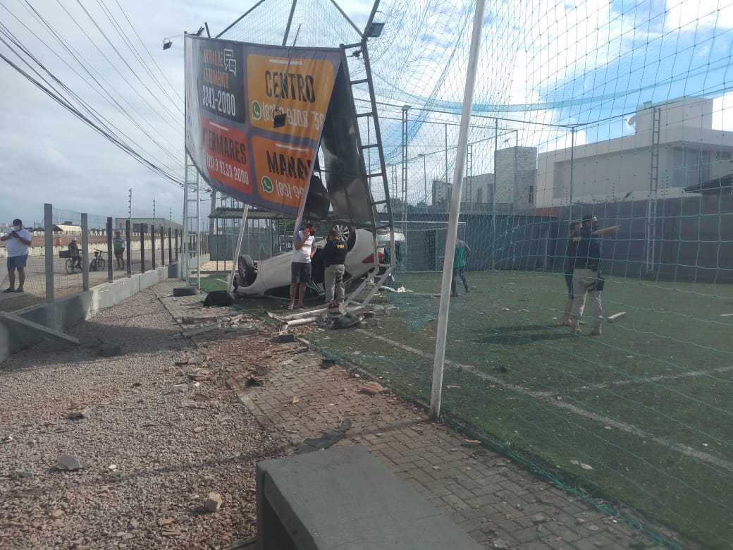Um veículo capotou e destruiu o muro de uma quadra esportiva na manhã deste domingo (18), na BR-230, sentido João Pessoa Cabedelo, na Paraíba.