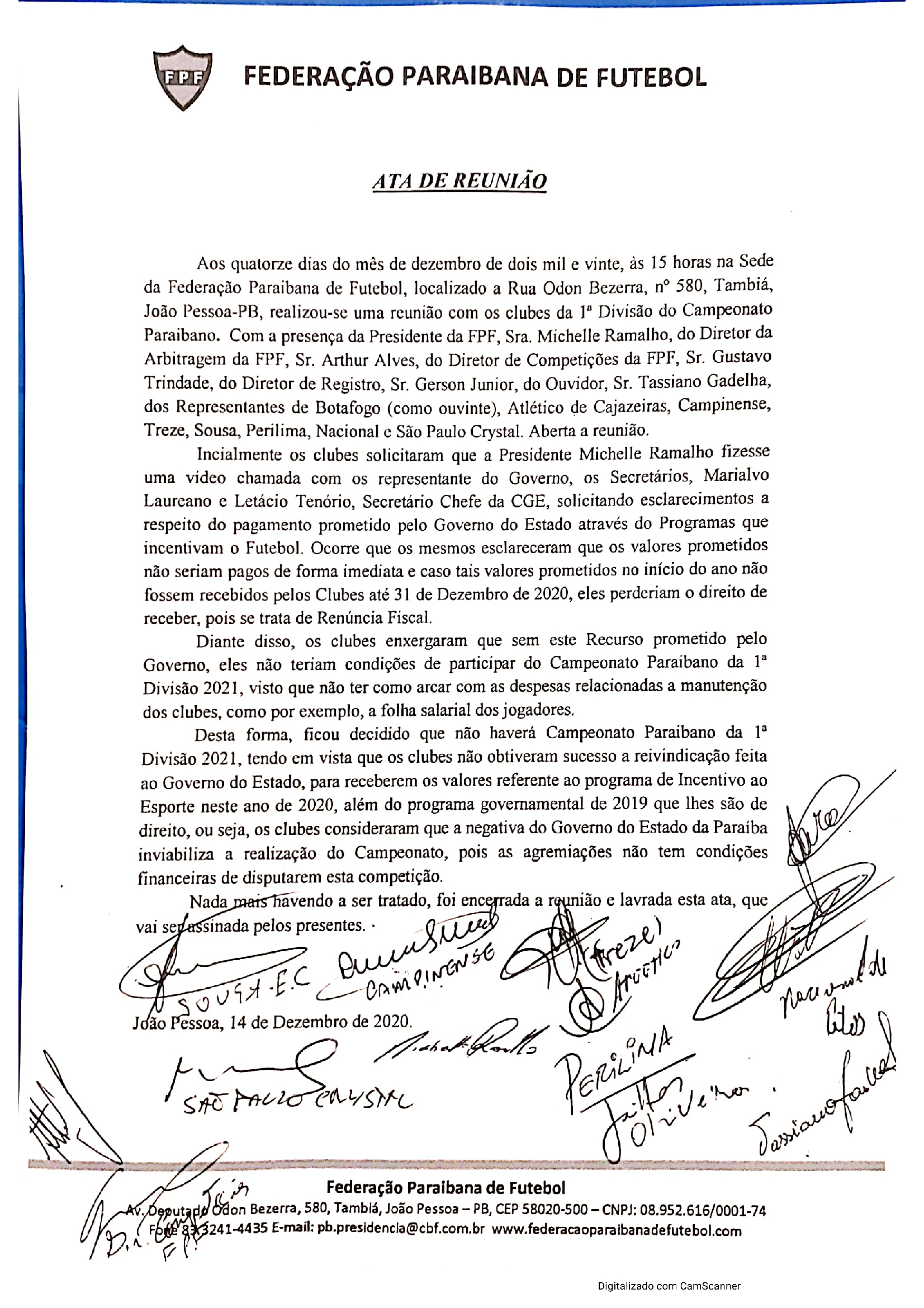 “Os clubes enxergam que sem este recurso prometido pelo Governo, eles não teriam condições de participar do Campeonato Paraibano da 1ª Divisão 2021, visto que não ter como arcar com as despesas relacionadas a manutenção dos clubes, como por exemplo, a folha salarial dos jogadores”, diz a ata, assinada pelos presentes.