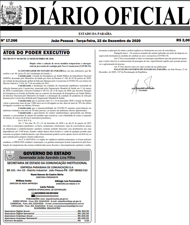 O Governo da Paraíba emitiu nesta segunda-feira (21) um novo decreto para disciplinas as atividades comerciais em meio à pandemia do novo coronavírus. Através do decreto fica estabelecido que os bares e restaurantes da Paraíba só poderão funcionar até 15 horas na véspera e dia de Natal e Ano Novo.