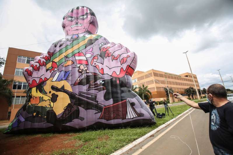 Um boneco gigante inflável com a imagem de Bolsonaro, com as mãos sangrando, foi colocado em frente à sede da agência, que está reunida neste momento para decidir se permite ou não o uso emergencial da Coronavac e da vacina desenvolvida pela Universidade de Oxford e a farmacêutica AstraZeneca.