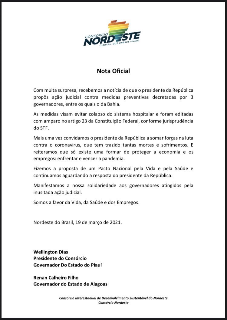 “Com muita surpresa, recebemos a notícia de que o presidente da República propôs ação judicial contra medidas preventivas decretadas por 3 governadores, entre os quais o da Bahia. As medidas visam evitar colapso do sistema hospitalar e foram editadas com amparo no artigo 23 da Constituição Federal, conforme jurisprudência do STF”, destacou a nota do fórum de governadores do Nordeste.