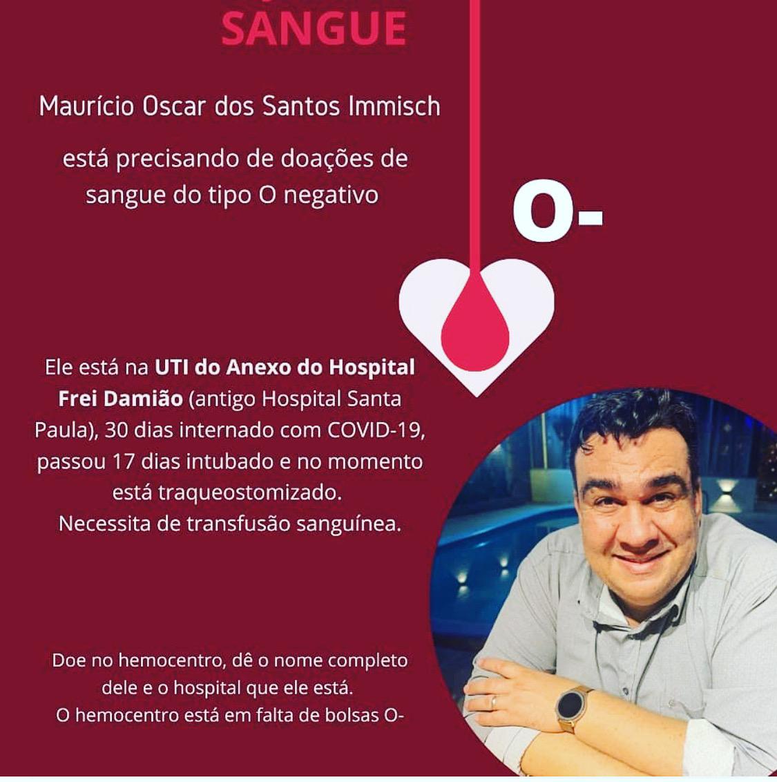 O radialista paraibano Maurício Oscar dos Santos Immisch, conhecido profissionalmente como Marcelo Vilar, precisa de doações de sangue O negativo. Ele está internado no anexo do Hospital Frei Damião há 30 dias com Covid-19. Neste período, Maurício passou 17 dias intubado. Depois, foi submetido a uma traqueostomia.