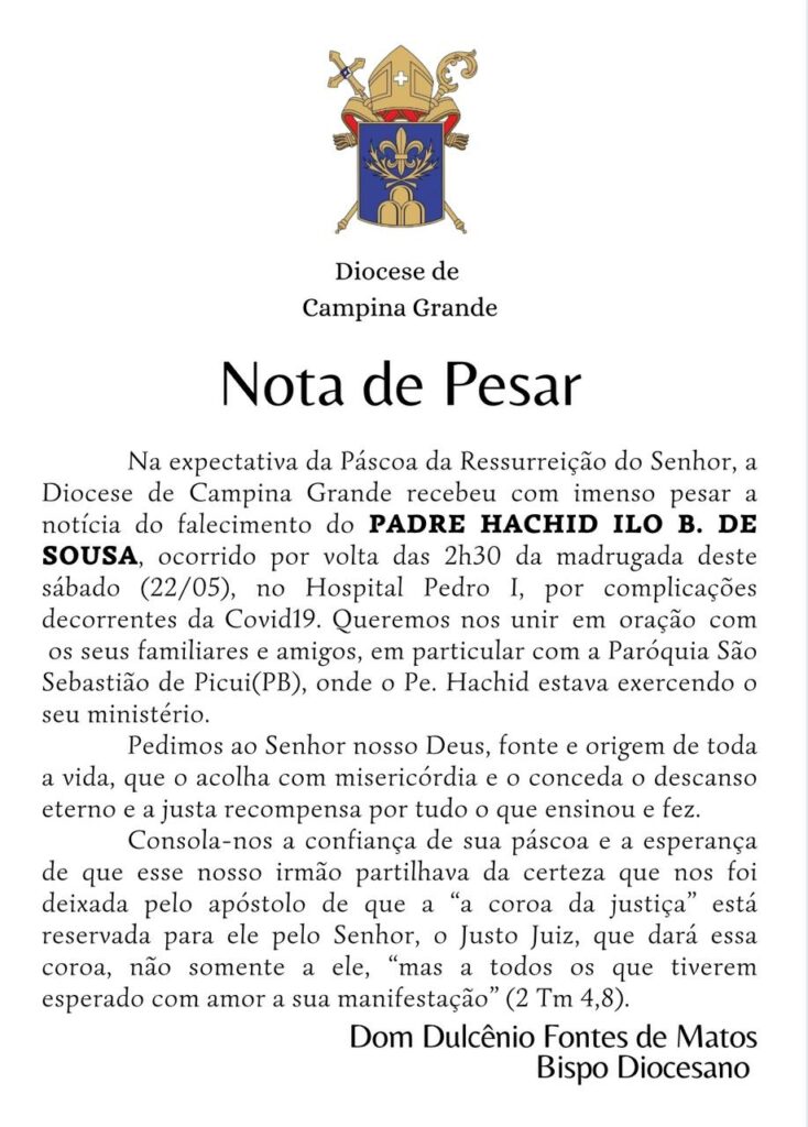 O padre Hachid Ilo B. de Sousa morreu na madrugada deste sábado (22), em Campina Grande, vítima de complicações da covid-19. Ele estava internado no Hospital Pedro I para tratar da doença, mas não resistiu e faleceu por volta das 2h30.