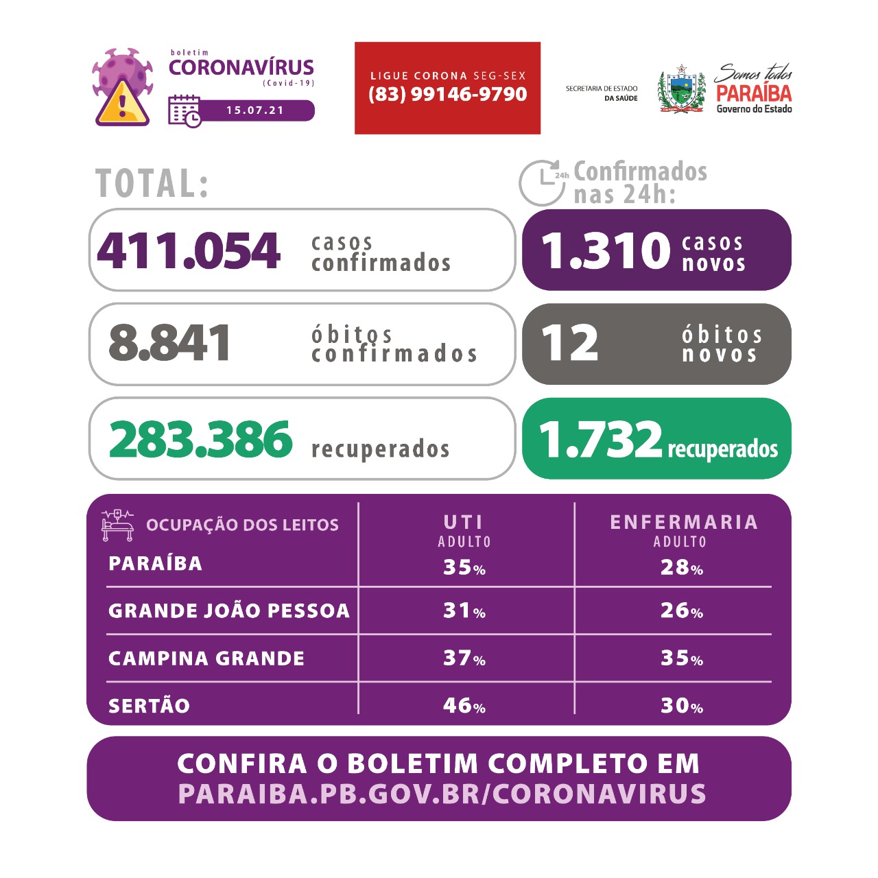 A Paraíba registrou, nesta quinta (15), 1.310 casos de Covid-19. Também foram confirmados 12 novos óbitos desde a última atualização, sendo 5 ocorridos nas últimas 24h. De acordo com o boletim epidemiológico divulgado pela Secretaria de Estado da Saúde (SES), desde a última atualização, 44 (3,36%) são casos de pacientes graves e 1.266 (96,64%) são leves.