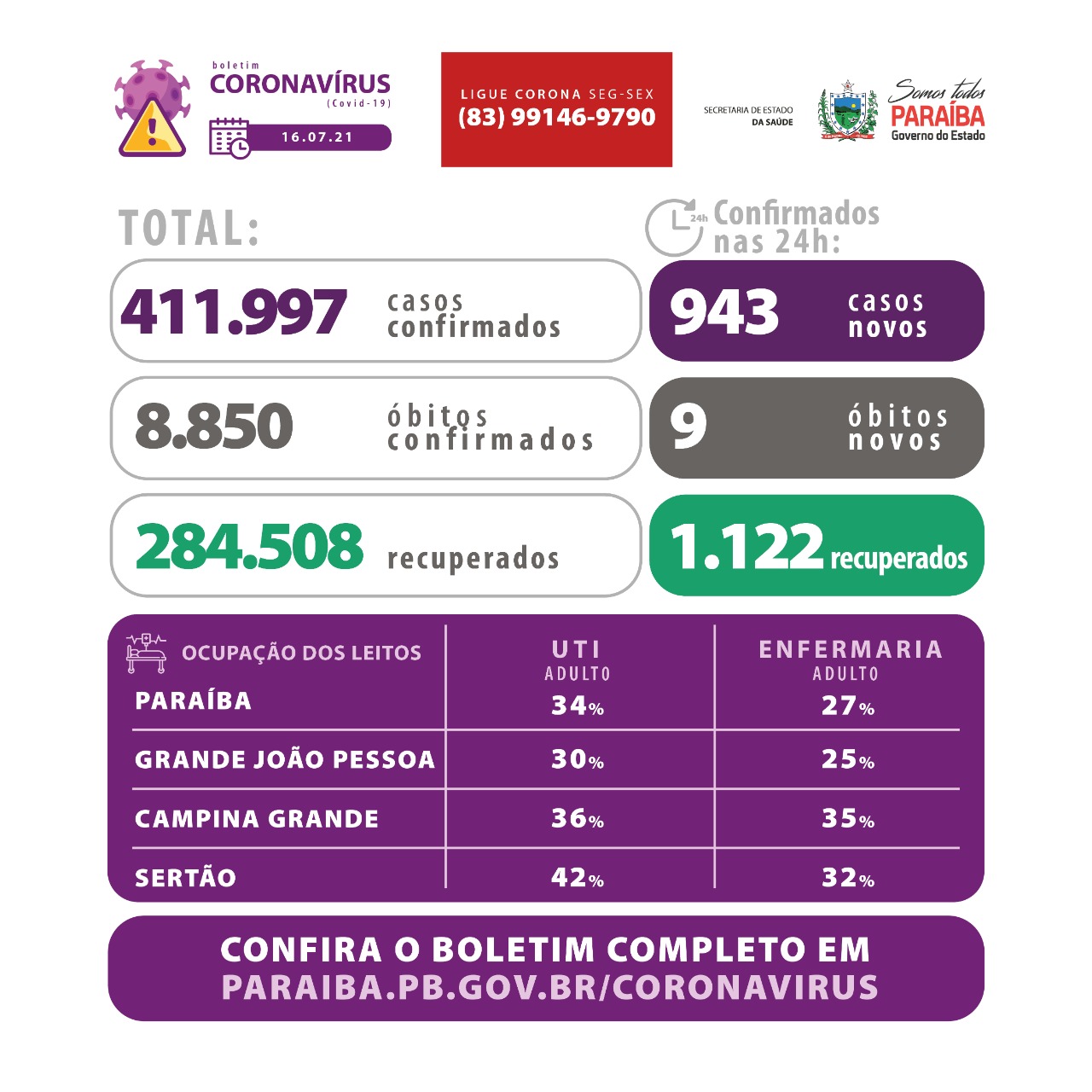 A Paraíba registrou, nesta sexta (16), 943 casos de Covid-19. Também foram confirmados 09 novos óbitos desde a última atualização, sendo 7 ocorridos nas últimas 24h. De acordo com o boletim epidemiológico divulgado pela Secretaria de Estado da Saúde (SES) desde a última atualização, 54 (5,73%) são casos de pacientes graves e 889 (94,27%) são leves.