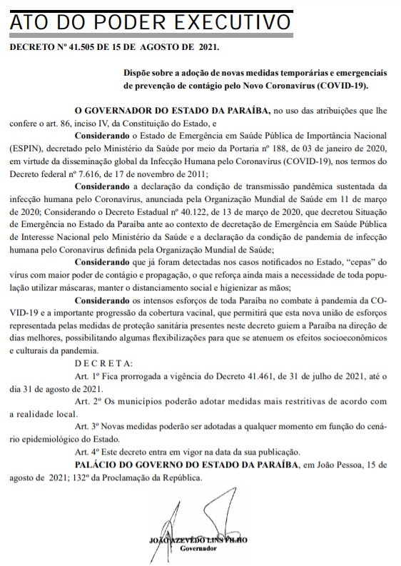 Um novo decreto foi publicado neste domingo (15) pelo Governo da Paraíba que prorroga as medidas de combate à pandemia no estado até o dia 31 de agosto.