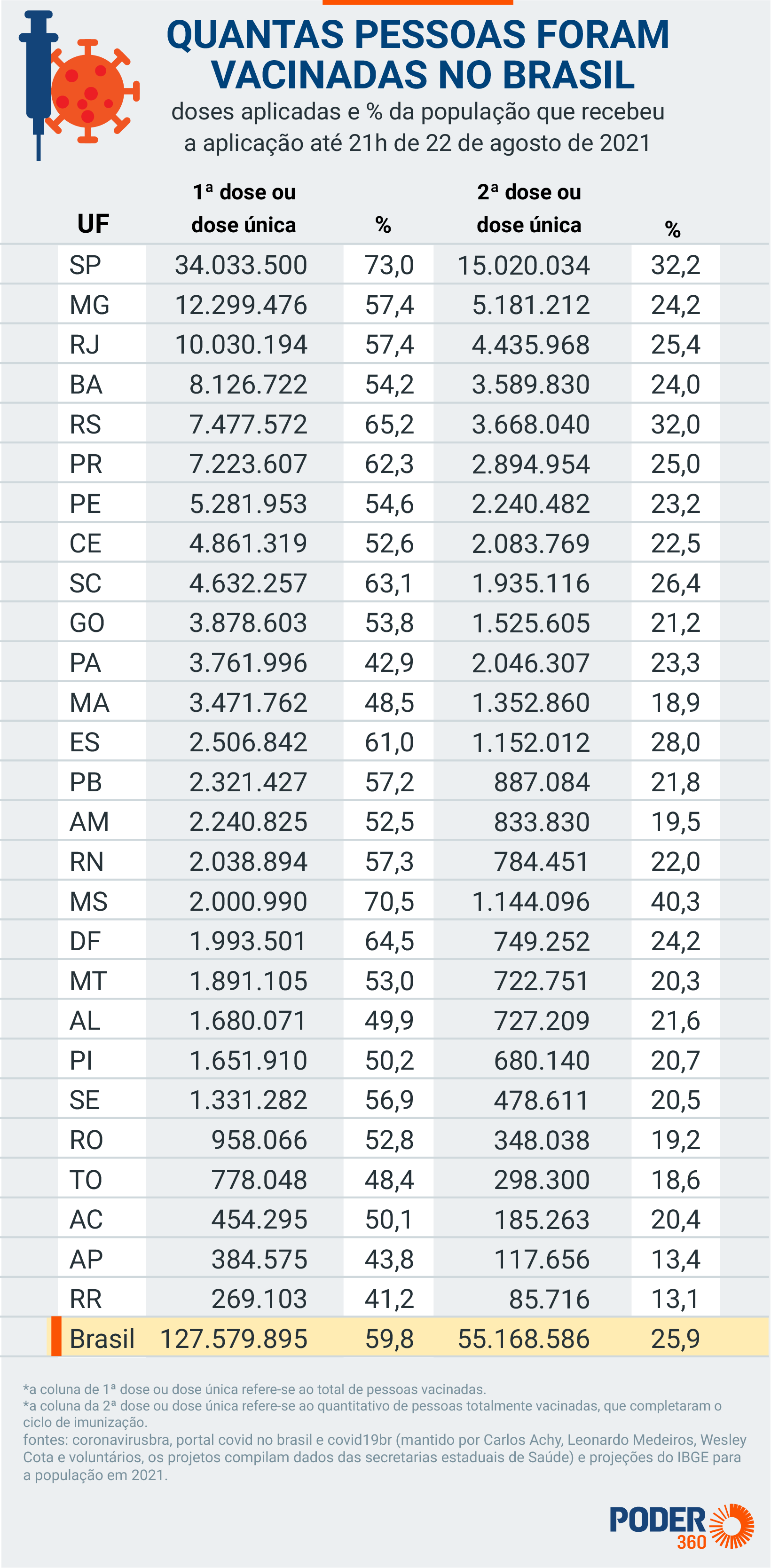 O Brasil vacinou mais de 127 milhões de pessoas com ao menos a 1ª dose de um imunizante contra a covid-19 . São 127.579.895 pessoas vacinadas com 1ª dose ou dose única até às 21h de domingo (22.ago.2021).