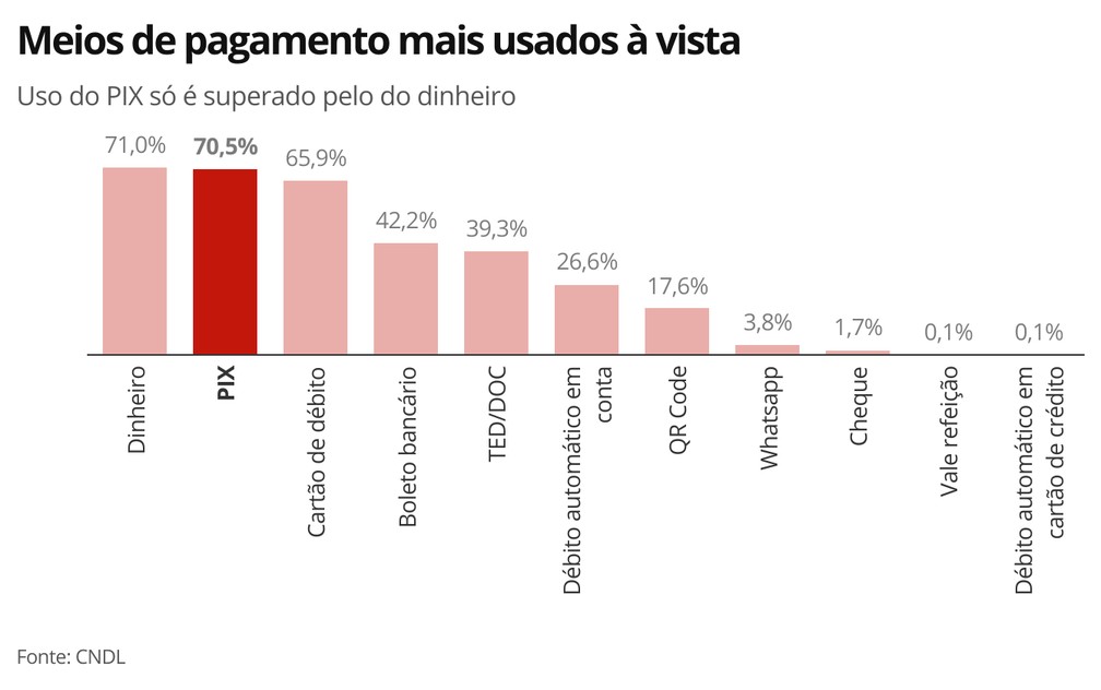 Menos de um ano após começar a funcionar, o PIX já é o segundo meio de pagamento mais usado pelos brasileiros nas contas à vista, aponta pesquisa da Confederação Nacional de Dirigentes Lojistas (CNDL), antecipada ao G1 – atrás apenas do dinheiro.