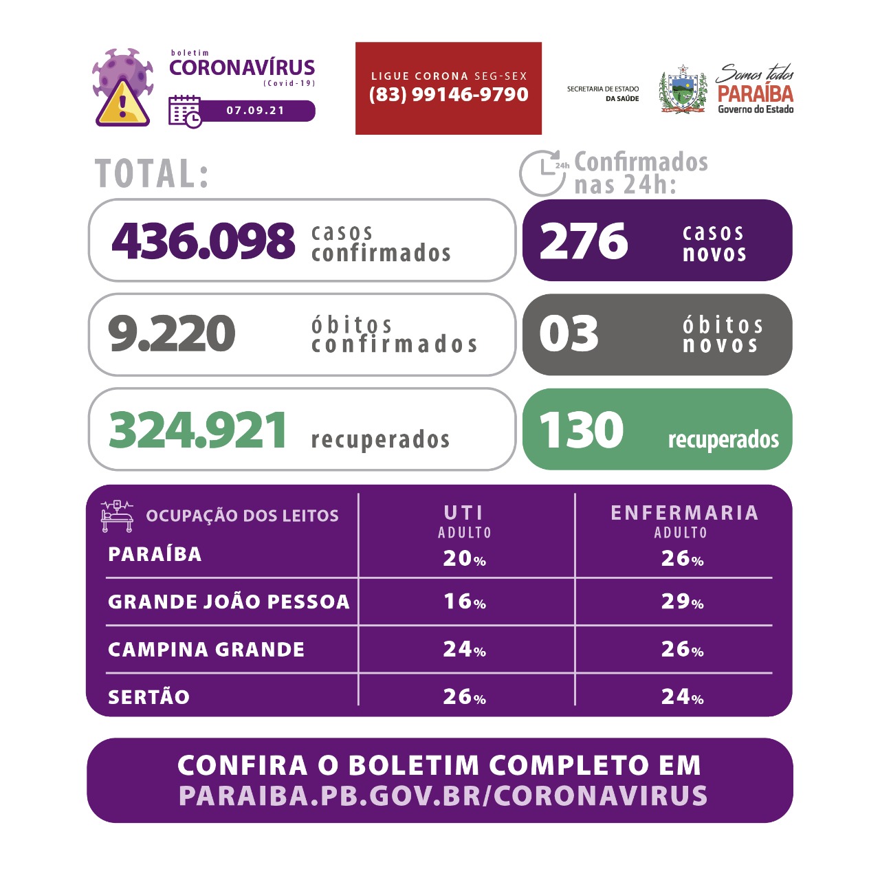 Os dados epidemiológicos com informações sobre todos os municípios e ocupação de leitos estão disponíveis em: www.paraiba.pb.gov.br/coronavi…