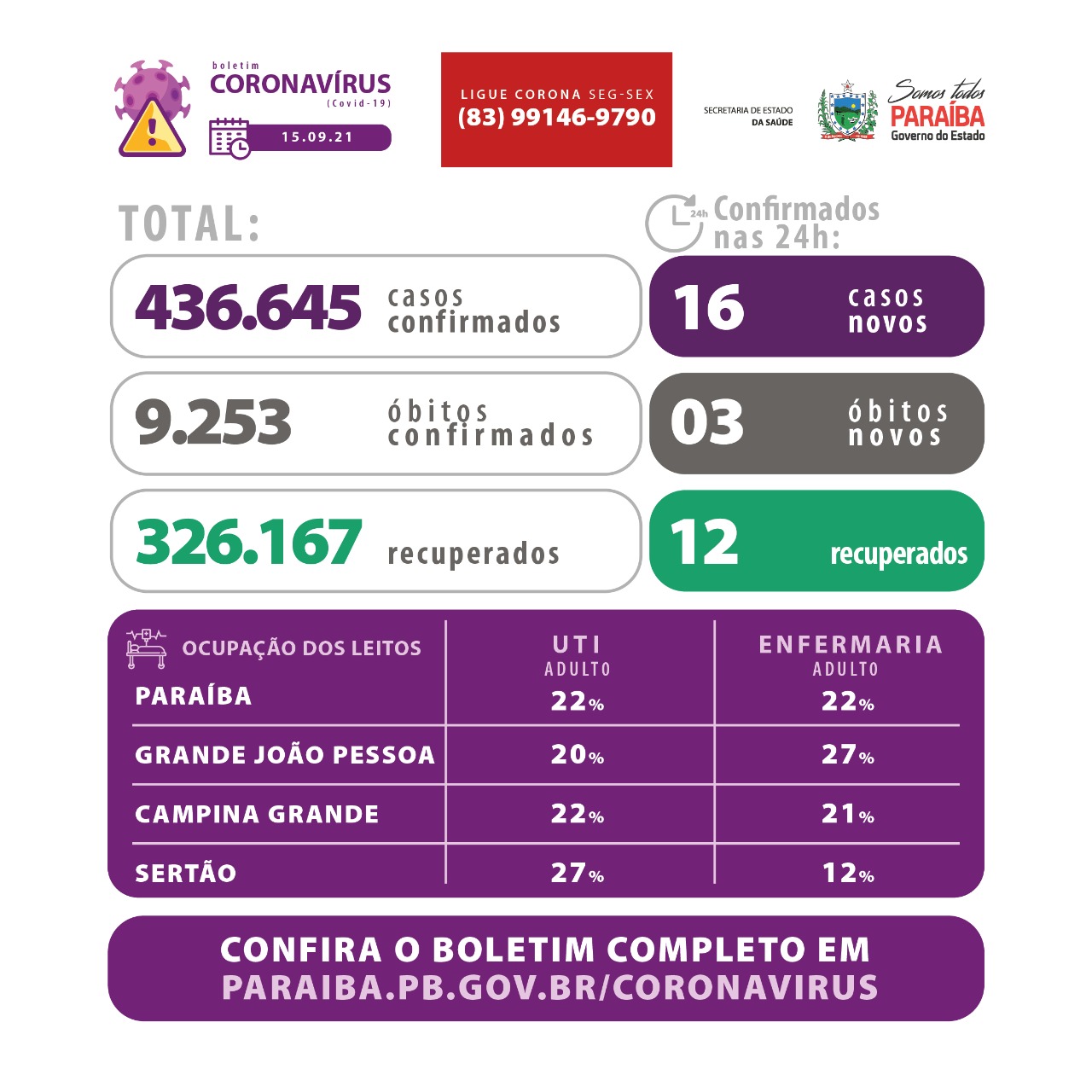 Até esta quarta, 222 cidades paraibanas registraram óbitos por Covid-19. Os óbitos confirmados neste boletim ocorreram entre os residentes dos municípios de Alagoa Nova (1); Belém do Brejo do Cruz (1) e Lagoa Seca (1). As vítimas são 02 homens e 01 mulher, com idades entre 74 e 84 anos. Cardiopatia foi a comorbidade mais frequente.