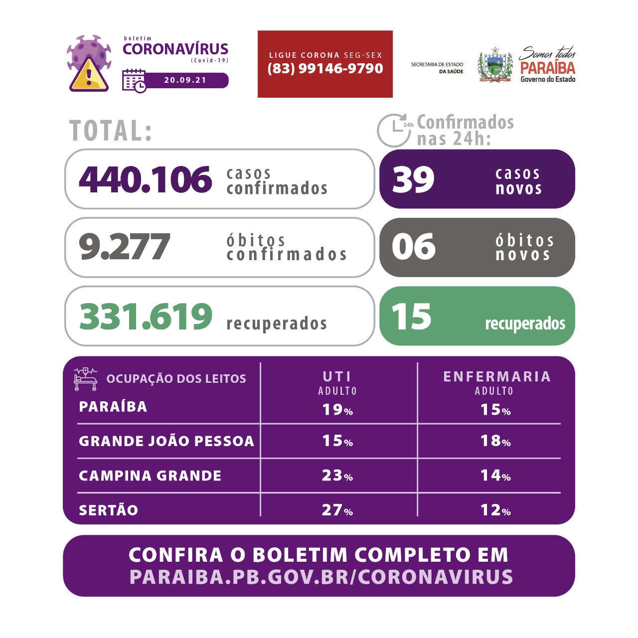 Agora, a Paraíba totaliza 440.106 casos confirmados da doença, que estão distribuídos por todos os 223 municípios. Até o momento, 1.181.965 testes para diagnóstico da Covid-19 já foram realizados.