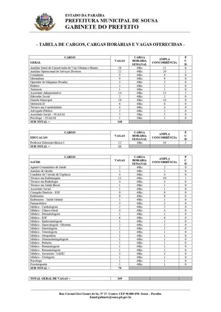 O prefeito de Sousa, no Sertão da Paraíba, Fábio Tyrone (Cidadania), anunciou um concurso público que deverá ser realizado ainda em 2021. Segundo informações disponibilizadas pela gestão municipal, serão disponibilizadas ao todo 249 vagas em diversas áreas.