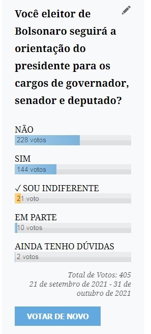 Uma enquete realizada pelo portal PB Agora apontou que a maioria dos eleitores do presidente Jair Bolsonaro (sem partido) na Paraíba não deverá seguir a orientação do gestor para os cargos seja de governador, senador ou de deputados federais ou estaduais.