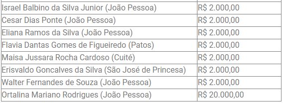Os 21 contemplados deste mês de outubro foram de oito cidades paraibanas: João Pessoa, Campina Grande, Cabedelo, Bayeux, Patos, Barra de Camaratuba, Cuité, São José de Princesa. Vinte deles vão receber a premiação de R$ 2 mil, enquanto o 21º, o prêmio especial de R$ 20 mil, foi para uma cidadã de João Pessoa. Neste 22º sorteio, três cidades tiveram os seus primeiros premiados: Barra de Camaratuba, Cuité, São José de Princesa.