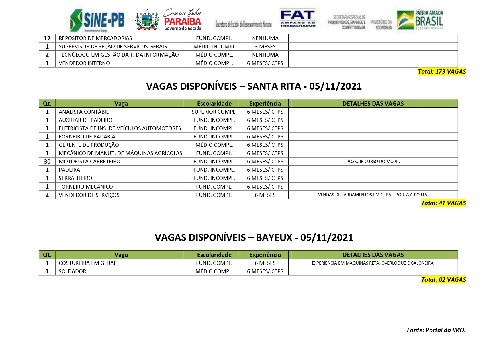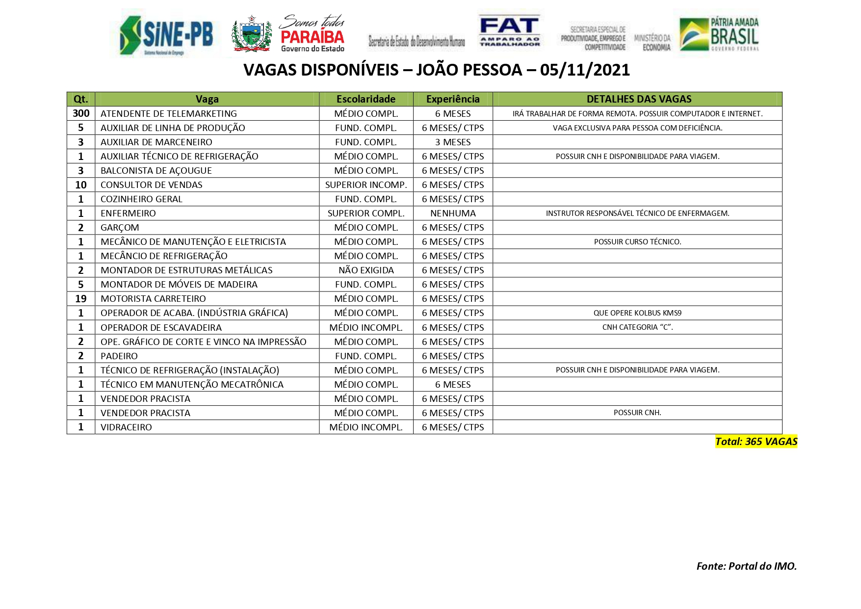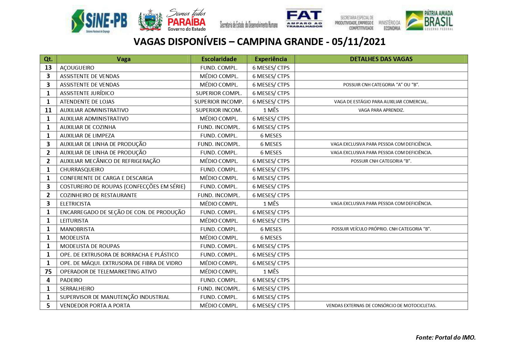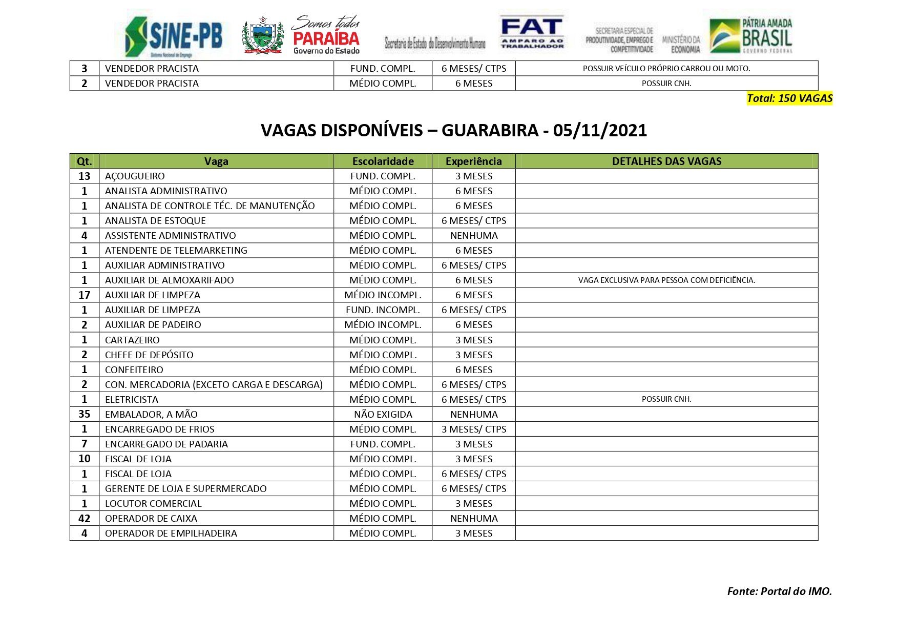 Em Guarabira, estão disponíveis 173 vagas, sendo 42 para operador de caixa e 35 para embalador a mão. Já em Campina Grande são 150 vagas, das quais 75 para operador de telemarketing ativo. As demais vagas estão distribuídas nas cidades de Santa Rita (41); São Bento (6); Bayeux (2).