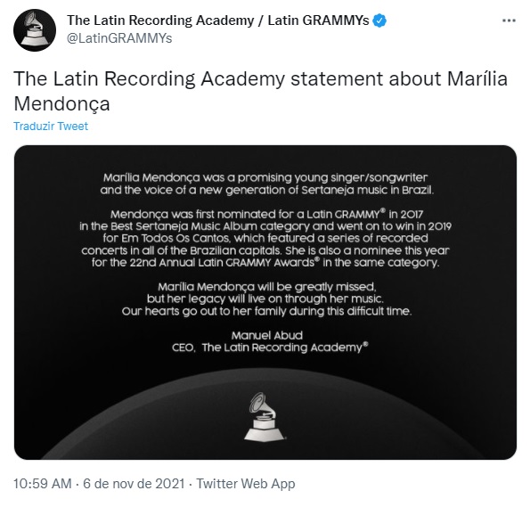 “Marília Mendonça foi uma jovem cantora/compositora promissora e voz de uma nova geração da música sertaneja no Brasil. Ela fará muita falta, mas seu legado viverá através da sua música. Nossos corações estão com sua família durante este momento difícil”, escreveu Manuel Abud, CEO do The Latin Recording Academy.