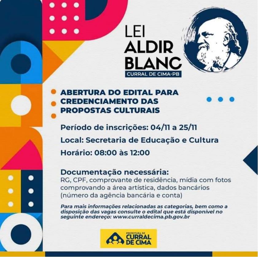 A Prefeitura de Curral de Cima abre o edital destinado ao setor cultural, conforme Lei Federal nº 14.017/2020, Lei Aldir Blanc. O credenciamento de propostas será na modalidade de chamamento público por meio do edital específico que os regulamentem.