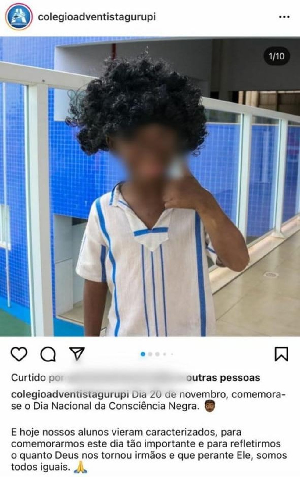 “Dia 20 de novembro comemora-se o Dia Nacional da Consciência Negra. E hoje nossos alunos caracterizados para comemorarmos este dia tão importante e para refletirmos o quanto Deus nos tornados irmãos e que perante ele, somos todos iguais. Me conta aqui nos comentários se você gostou da caracterização dos nossos alunos “, disse a escola no post.