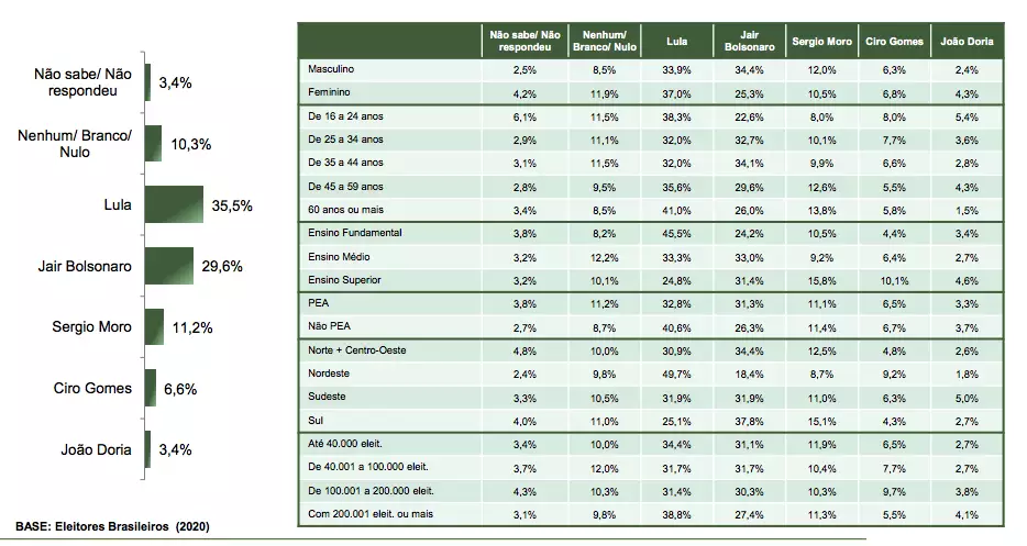 No Cenário 3, bastante provável, apenas com Moro, Ciro e Doria na disputa, Lula soma 35,5% contra 29,6% de Bolsonaro, subindo a diferença para 5,9%.