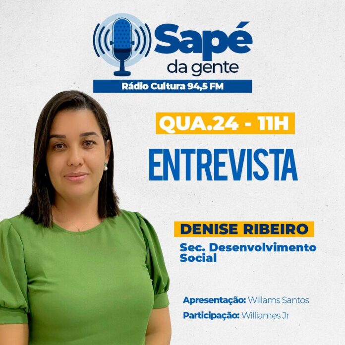 A Primeira Dama e atual secretária do Desenvolvimento Social do município de Sapé Denise Ribeiro, será a entrevistada do programa institucional de estreia do governo municipal. O programa que receberá o nome “SAPÉ DA GENTE” irá ao ar nesta quarta-feira (24) a partir das 11h pela Rádio Cultura FM 94,5.