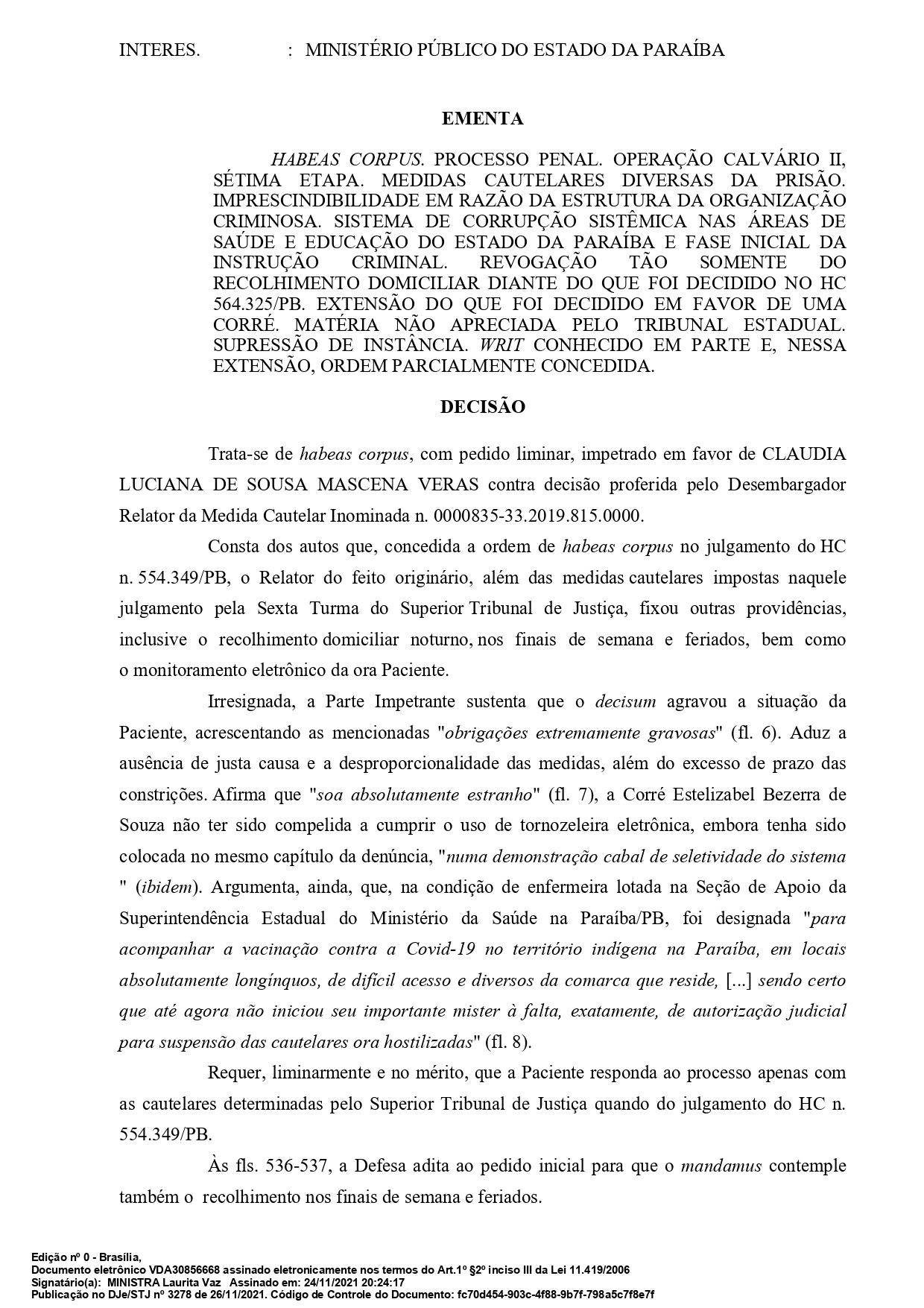 O Superior Tribunal de Justiça (STJ) negou o pedido da ex-secretária de Saúde da Paraíba, Cláudia Veras, para retirar a tornozeleira eletrônica. No entanto, a ministra Laurita Vaz revogou a medida cautelar de recolhimento domiciliar noturno. Esse pedido foi feito por meio de habeas corpus que foi deferido em parte pela ministra relatora e publicada a decisão monocrática nesta sexta-feira (26).