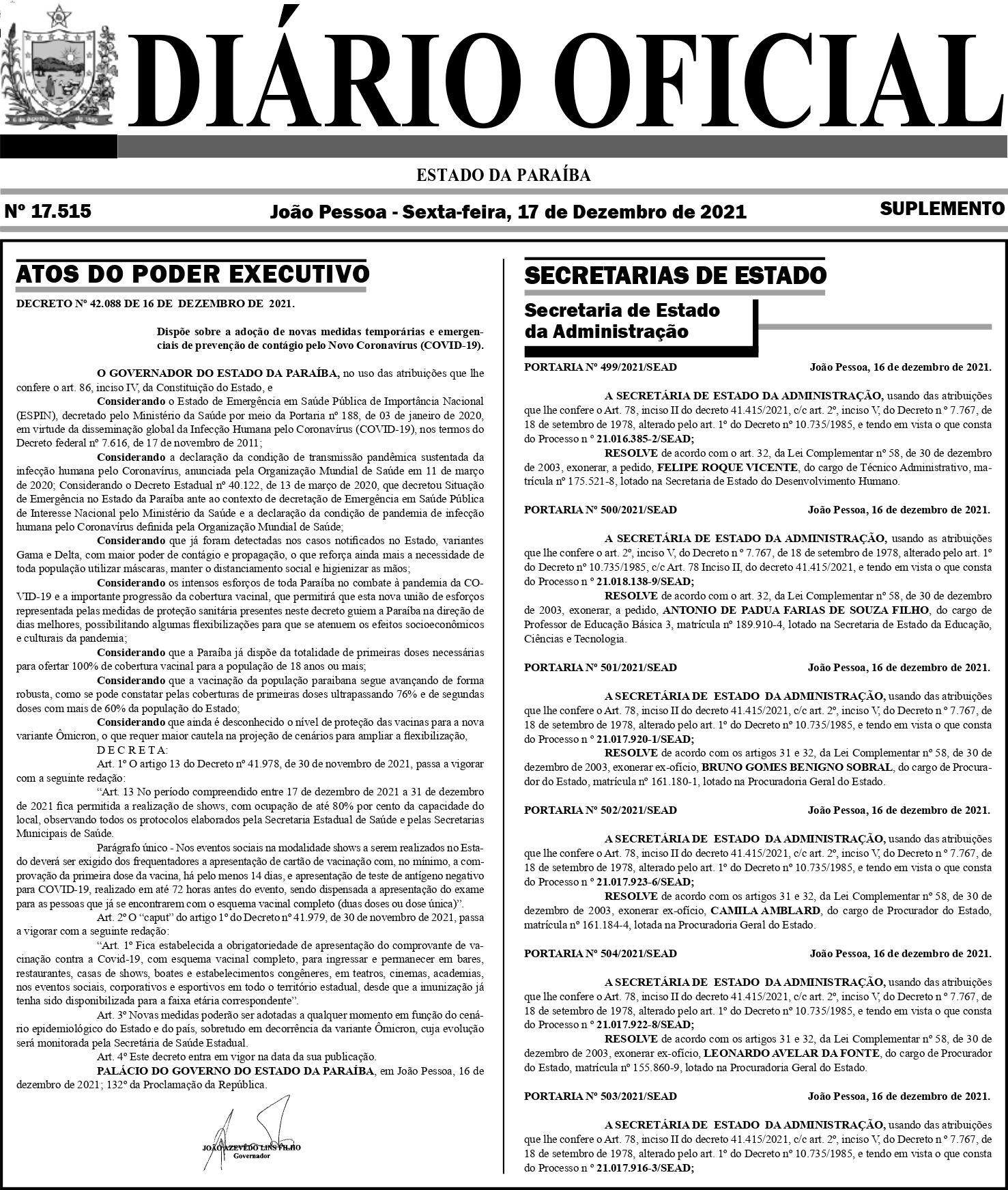 Um novo decreto estadual foi publicado, nesta sexta-feira (17), na Paraíba. Ele libera shows com capacidade de até 80% de público. O documento consta no Diário Oficial do Estado (DOE), em edição especial de um suplemento. O decreto começa a valer a partir de hoje e se estende a até 31 de dezembro.