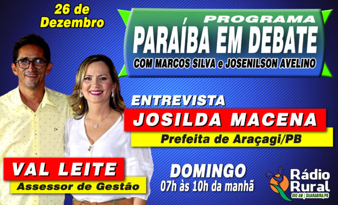 Neste domingo (26), das 07h às 10h da manhã, na Rádio Rural de Guarabira, haverá o jornalístico Paraíba em Debate, sob a apresentação dos jornalistas Marcos Silva e Josenilson Avelino. Na ocasião, serão entrevistados a prefeita Josilda Macena e o Assessor de Gestão, Val Leite, da cidade de Araçagi.