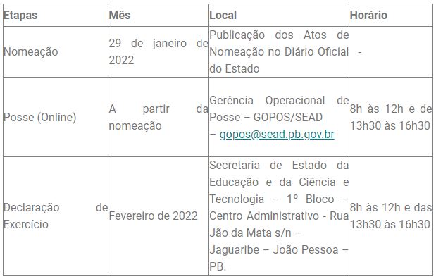 As nomeações serão publicadas no Diário Oficial do Estado (DOE) no dia 29 de janeiro. Os professores serão convocados para posse efetiva, em cerimônia que acontecerá de forma remota.