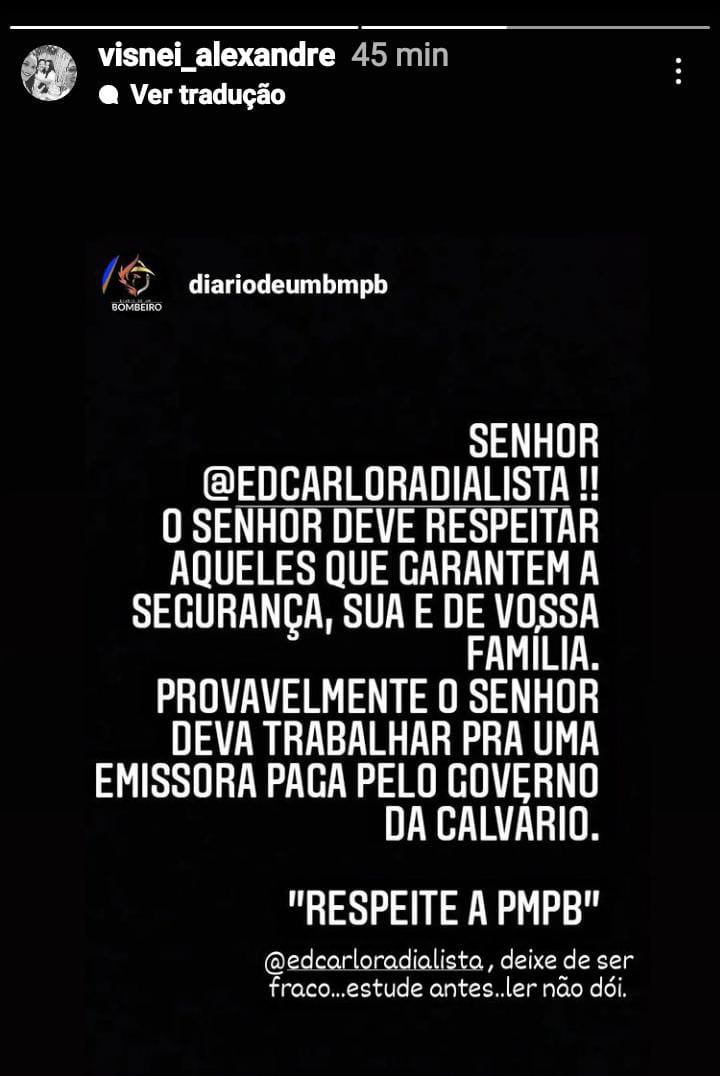 “Houve um grande mal-entendido, bastar ouvir o meu comentário, diante das informações que foram apresentadas, não foram informações falsas, mas sim o relato do diálogo com o governo e suas propostas pra categoria. Mas sim, o policial que me atacou, ou os que me atacaram, de fato, não representam a instituição polícia militar e são covardes, não honram a farda, digo sem medo, porque sou amigo pessoal de diversos coronéis, comandantes e tenho diversos títulos de amigo da corporação em Guarabira, quem me atacou não conhece minha história, meu trabalho e minha dignidade, sou um profissional quem toda a minha carreira, defendia a polícia militar e não tenho nenhum processo no âmbito profissional, respeito a PM, mas não tenho medo, sou um homem de bem, honrado e digno”, destou Edcarlo, em relato ao portal Nordeste1.