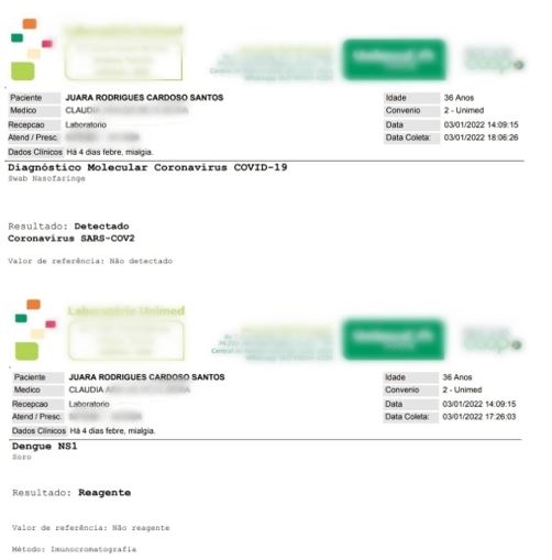 O médico que atendeu o casal sugeriu que eles fizessem exames de Covid-19 e dengue. O resultado do primeiro exame de Juara veio no dia 3 de janeiro, com a confirmação de um diagnóstico positivo para dengue. A engenheira revela que chegou a ficar menos preocupada, até o casal pegar o resultado do segundo exame no dia seguinte.