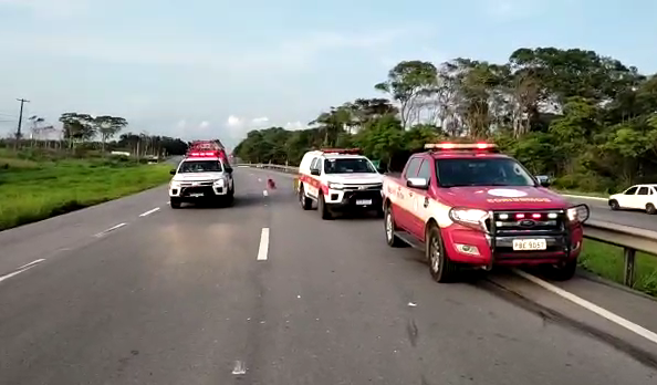 A Polícia Rodoviária Federal (PRF) foi acionada e uma faixa da rodovia teve o fluxo e veículos interrompido.