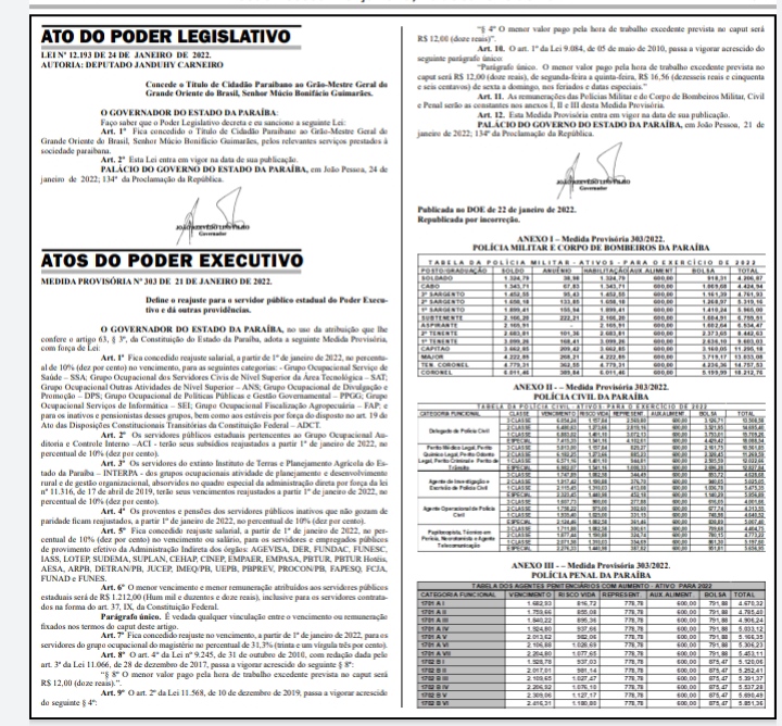 Publicado no Diário Oficial reajuste do salário dos servidores públicos estaduais da Paraíba
