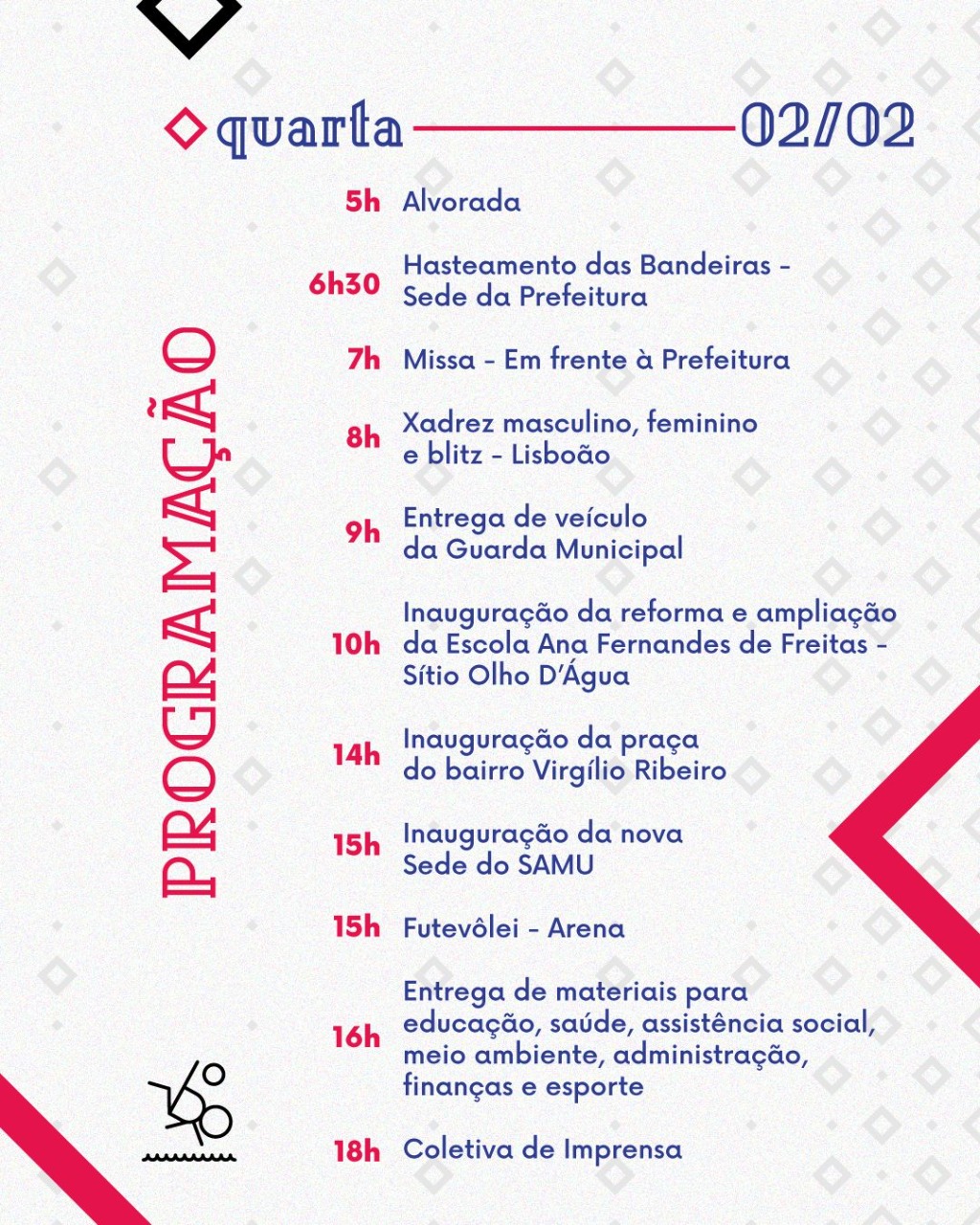 Eventos esportivos, inauguração, culto, missa e entrega de veículo e materiais são algumas das comemorações alusivas que farão parte das festividades do município.