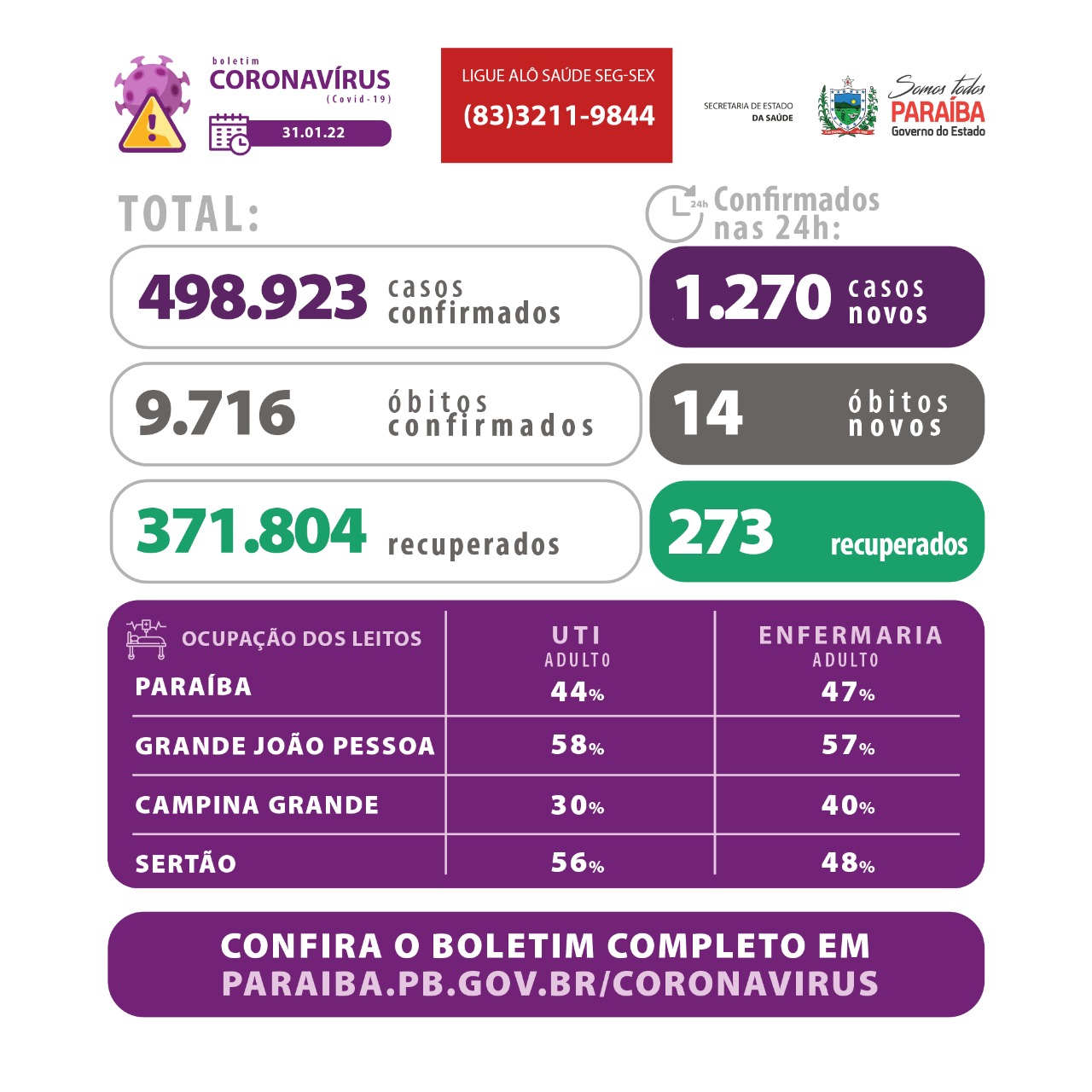 A Secretaria de Estado da Saúde (SES) registrou, nesta segunda (31), 1.270 casos de Covid-19. Entre os casos confirmados neste boletim, 29 (2,28%) são moderados ou graves e 1.241 (97,72%) são leves. Agora, a Paraíba totaliza 498.923 casos confirmados da doença, que estão distribuídos por todos os 223 municípios. Até o momento, já foram realizados 1.323.002 testes para diagnóstico da Covid-19.