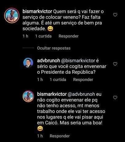 Bismark Victor comentou em uma notícia da viagem do presidente Jair Bolsonaro ao Rio Grande do Norte: “Quem será que vai fazer o serviço de colocar veneno? Faz falta alguma. É até um serviço de bem pra sociedade”. O comentário repercutiu e foi parar na Polícia Federal, que já está na cidade para fazer a segurança do presidente que visita o município.