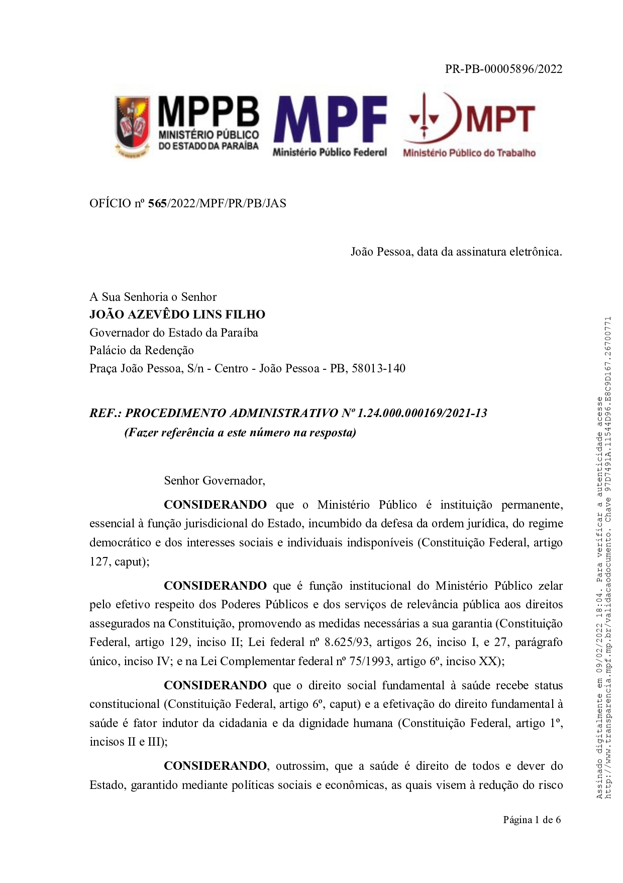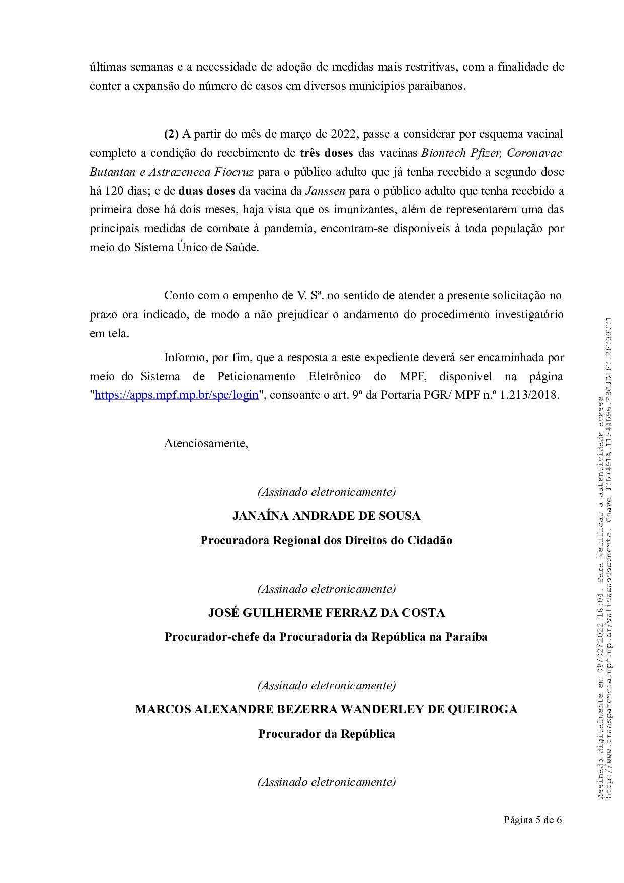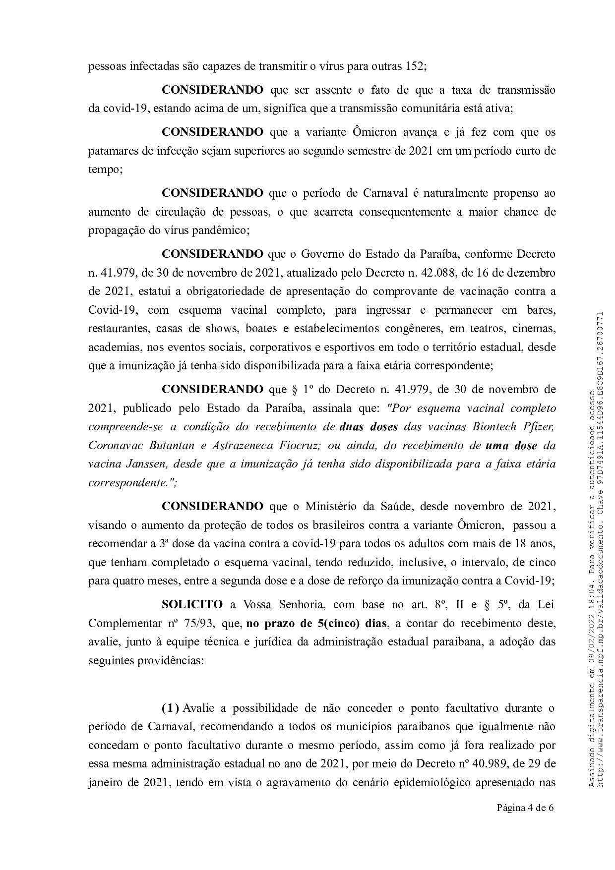 Em um ofício, os Ministérios Públicos da Paraíba (MPPB), Federal (MPF) e do Trabalho (MPT) solicitaram, que no prazo de cinco dias, o Governo do Estado, junto com sua equipe, avalie a possibilidade de suspensão do ponto facultativo de Carnaval assim como ocorreu em 2021. Além disso, pediu que, a partir de março deste ano, seja considerado esquema vacinal completo as três doses para aqueles que tomaram a segunda dose há 120 dias.