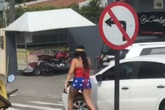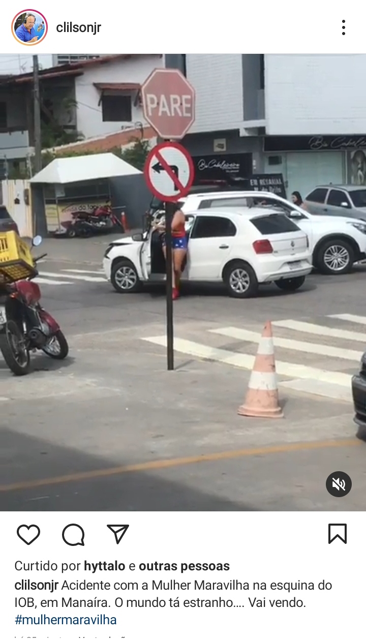 O que chama atenção, é que a condutora de um dos veículos estava vestida de mulher maravilha. Um vídeo publicado no perfil do jornalista mostra a mulher saindo do veículo fantasiada e verificando o prejuízo da colisão.