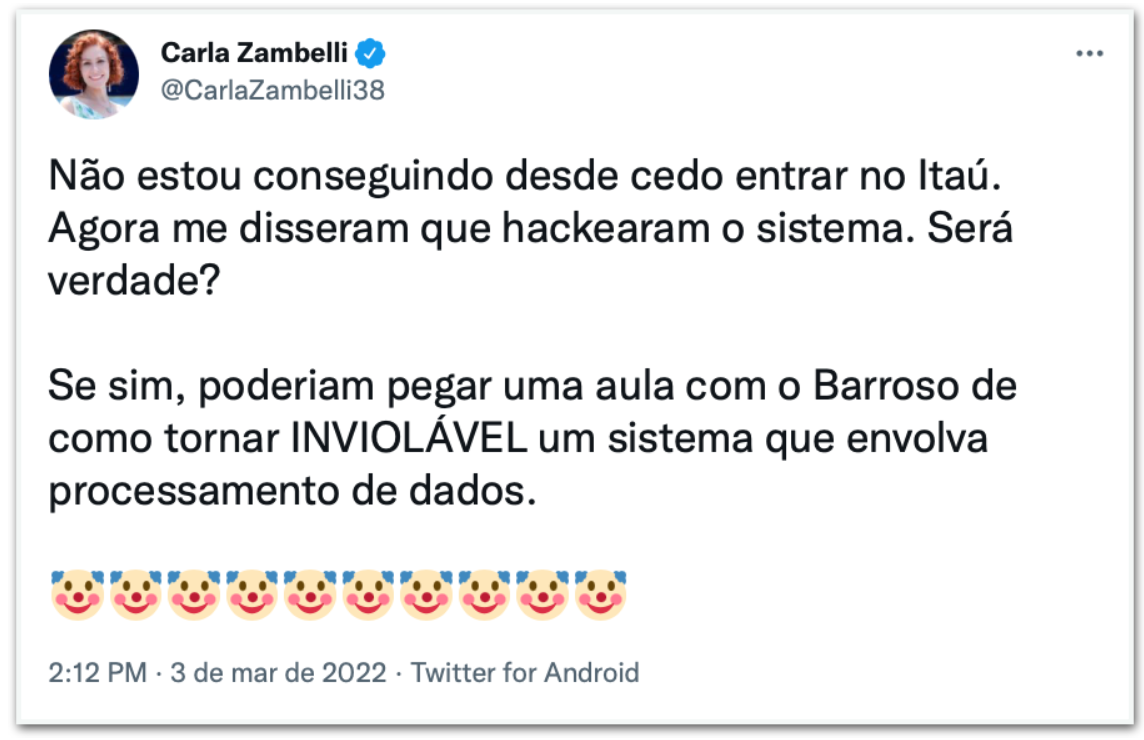 “Não estou conseguindo desde cedo entrar no Itaú. Agora me disseram que hackearam o sistema. Será verdade? Se sim, poderiam pegar uma aula com o Barroso de como tornar inviolável um sistema que envolva processamento de dados”, escreveu Zambelli.