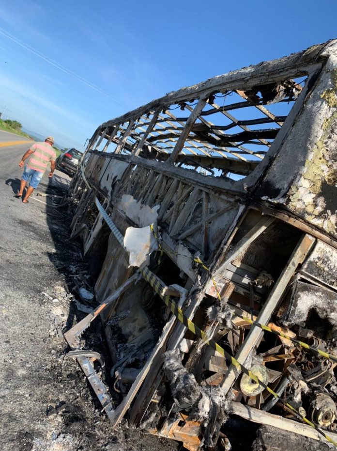 O ônibus pertencente a uma empresa privada que presta serviço à Prefeitura de Itaporanga, ficou completamente destruído pelas chamas.